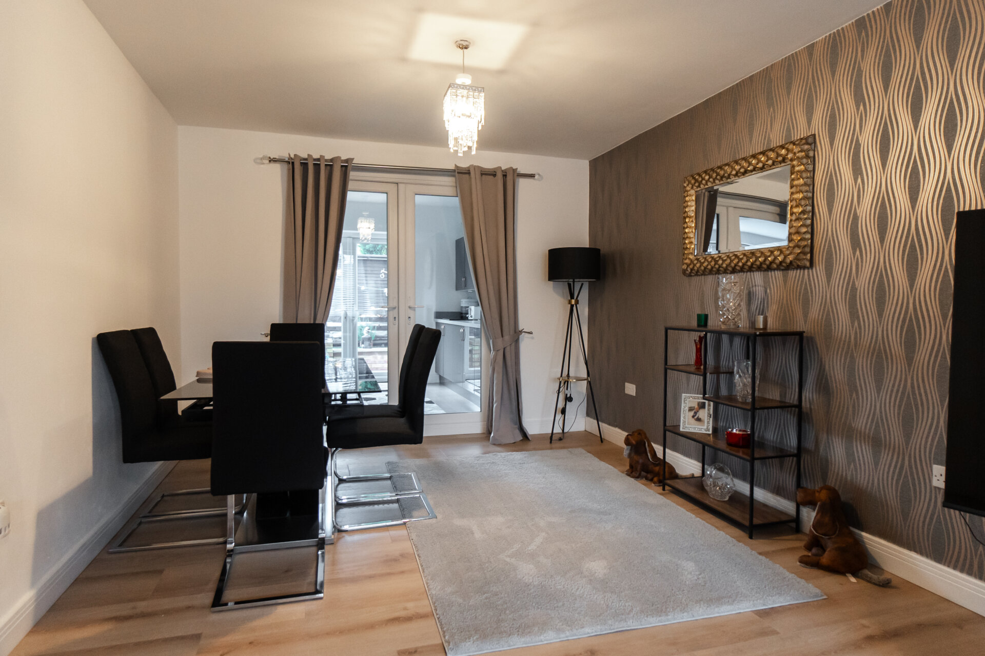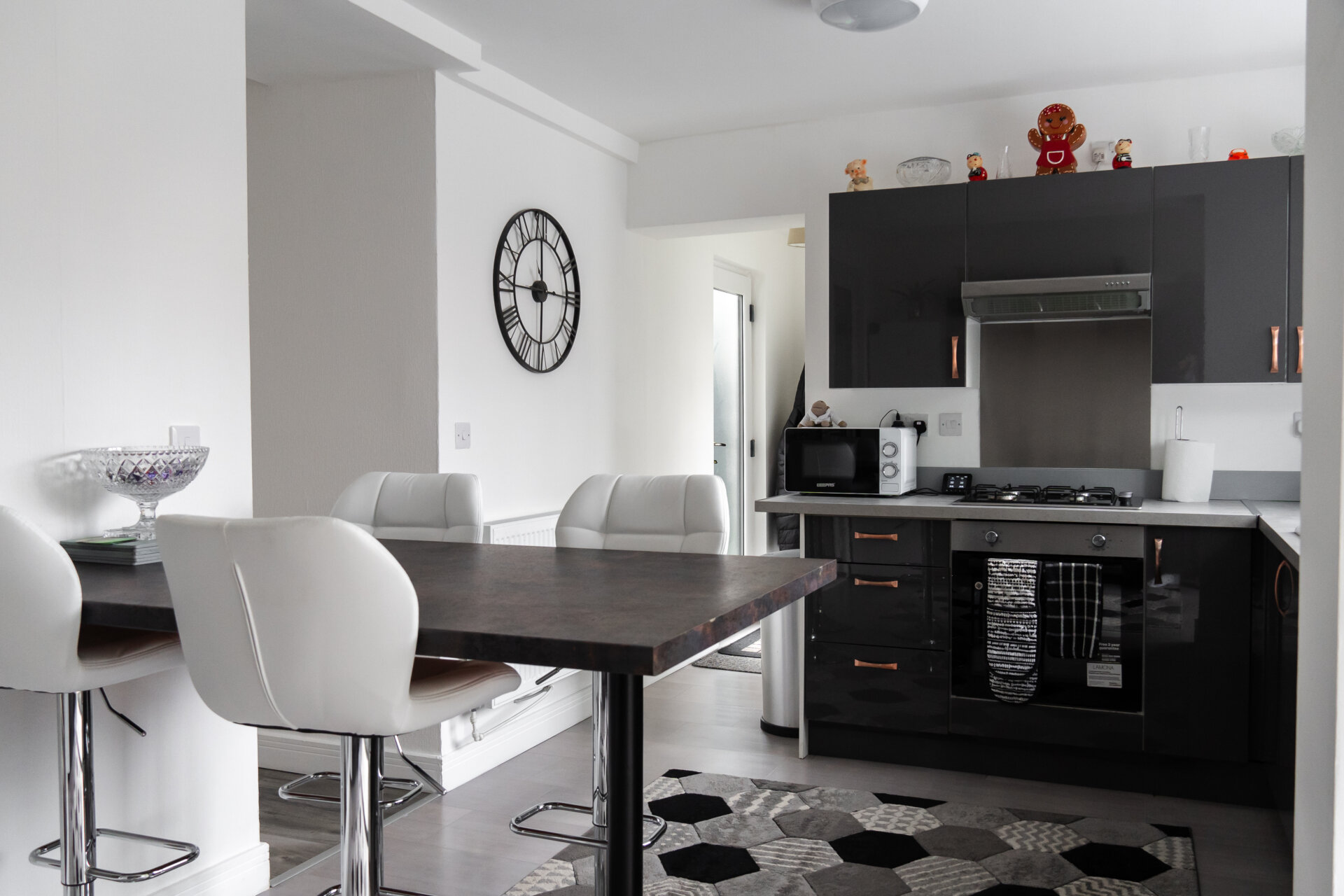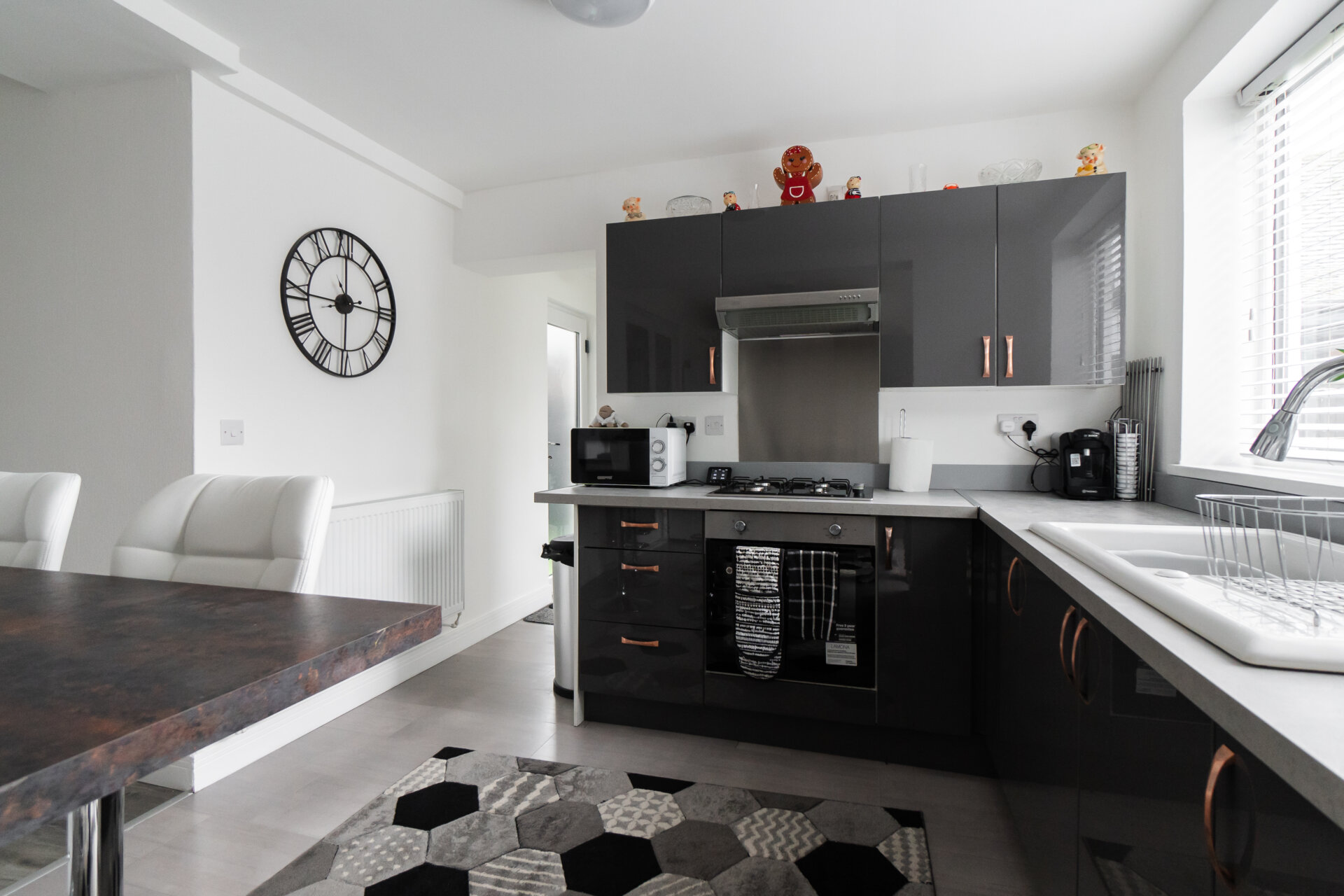Newley fitted grey high gloss, wall, base and drawer units with work surface over, ceramic sink and drainer with mixer tap over, breakfast bar, splashbacks, built-in oven, gas hob and extractor hood over, appliance space, UPVC double glazed windows and patio doors to the rear and open to