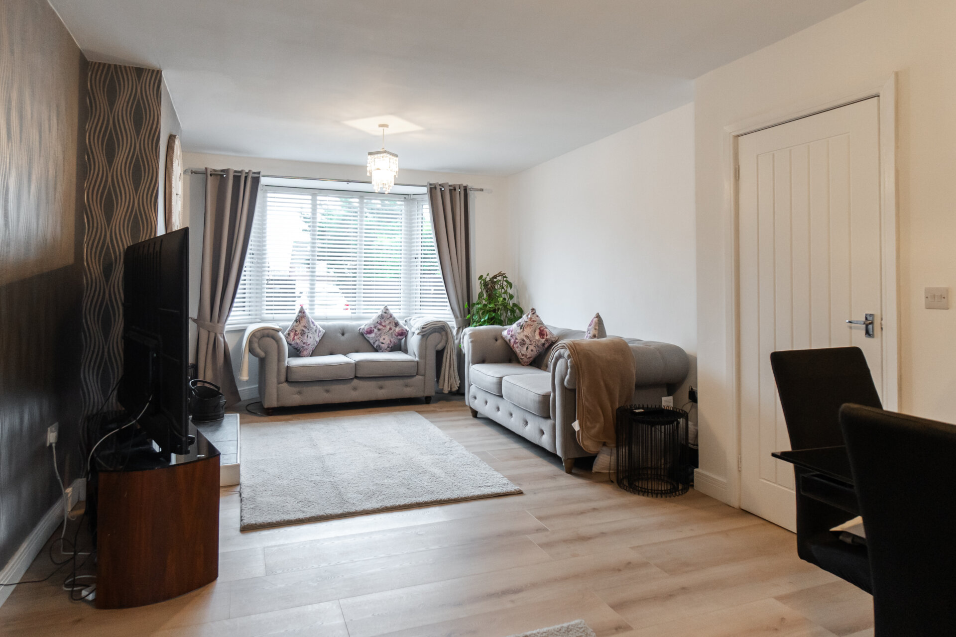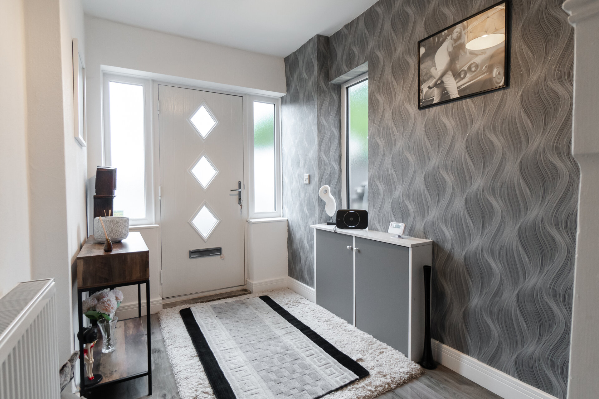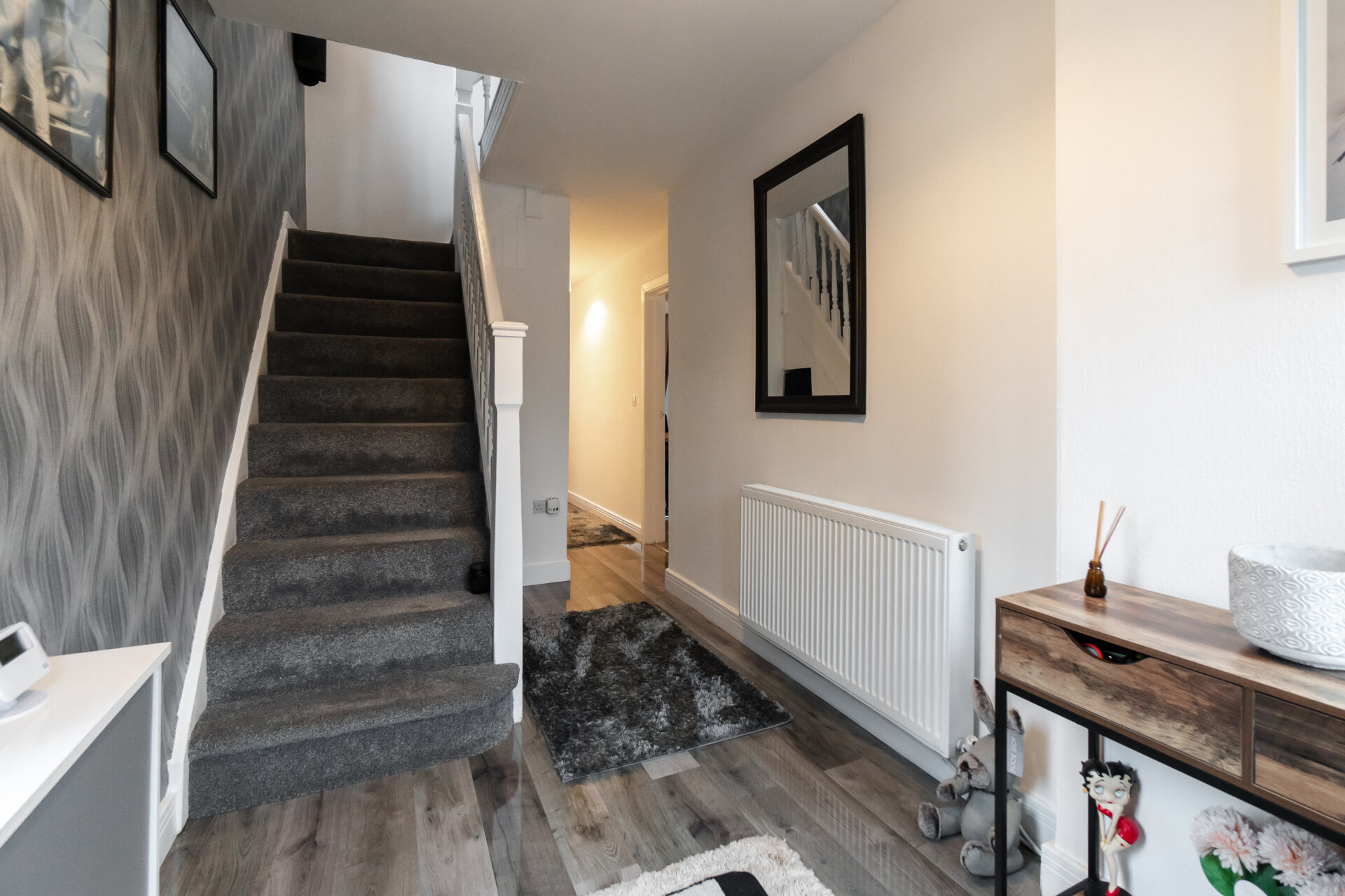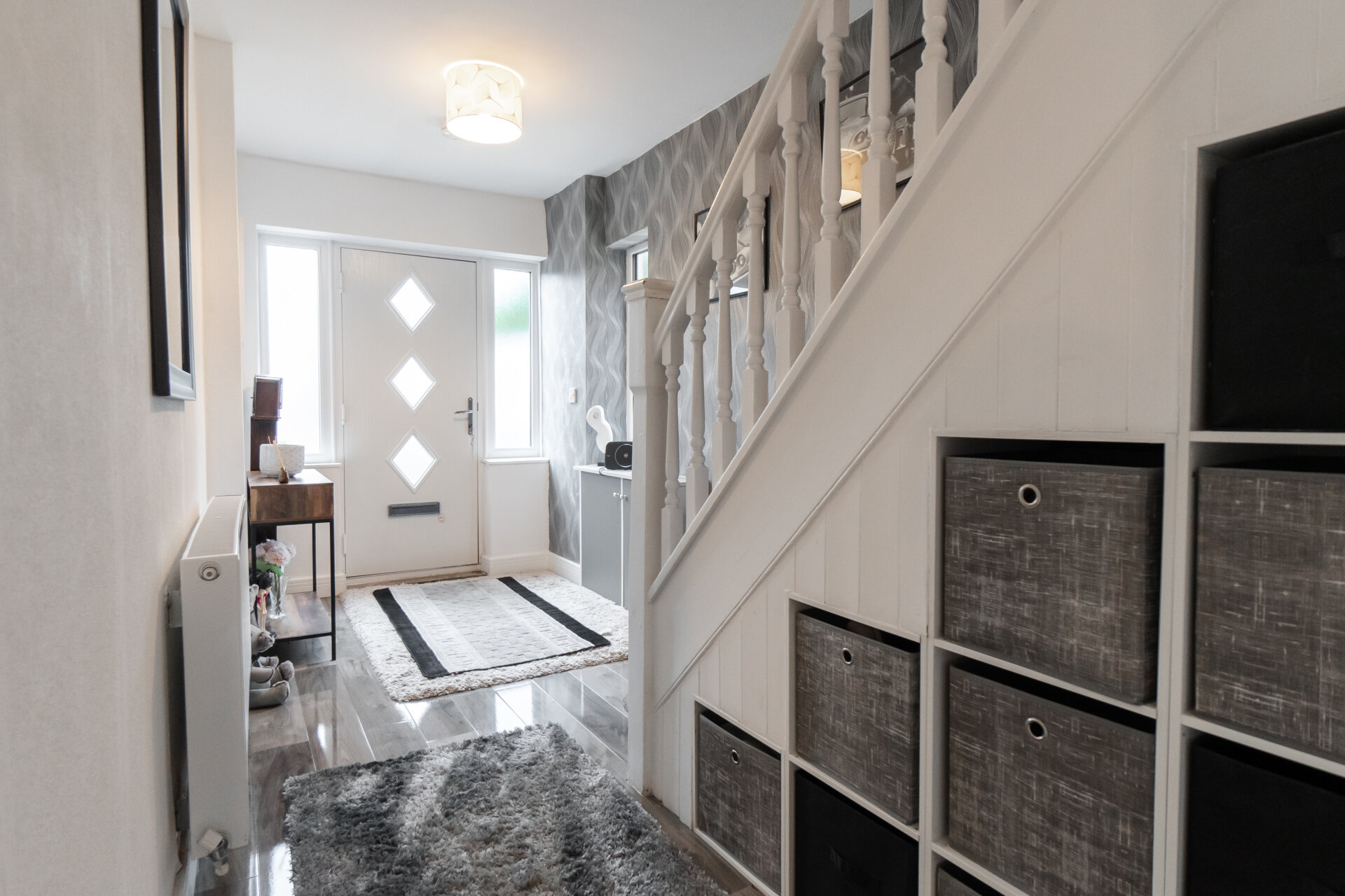 Composite front entrance door to the front, laminate floor, stairs to the first floor landing, radiator and doors to