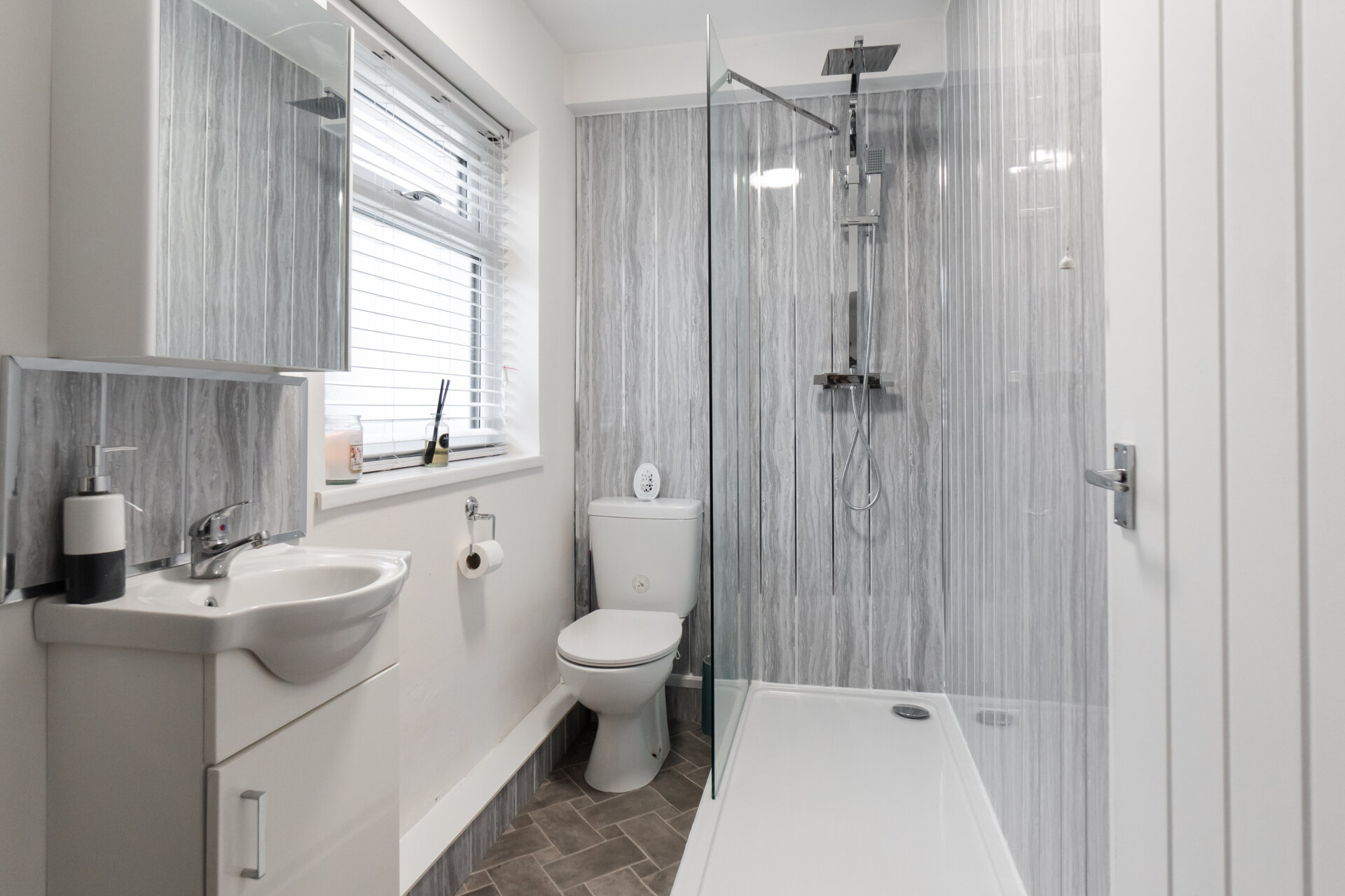 Walk-in shower cubicle with waterfall shower head and a hand held shower head, low flush w.c, sick with storage, splashbacks, UPVC double glazed window to the side and chrome heated towel rail.