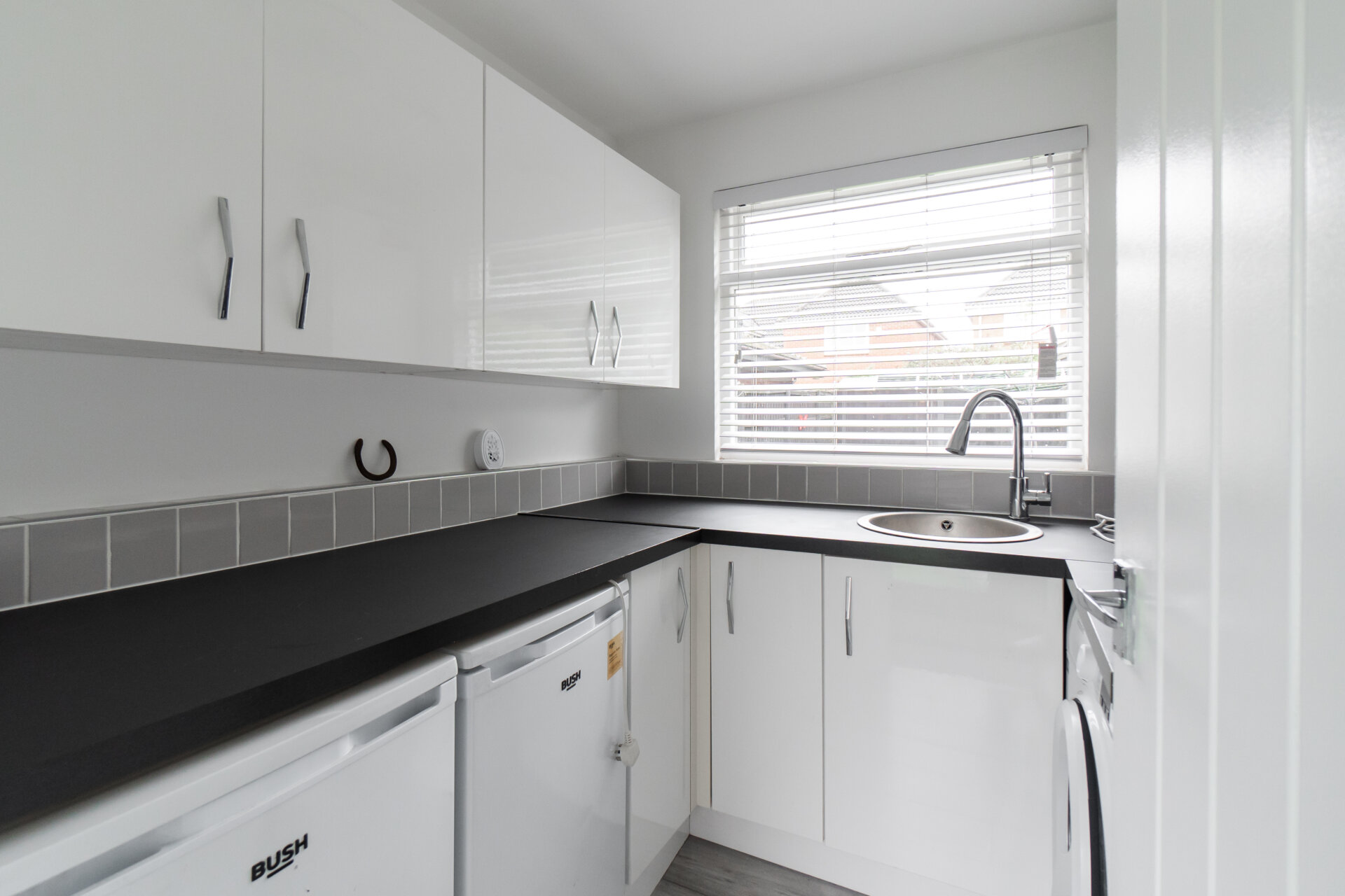 Wall & base units with work surface over, sink and mixer tap over, plumbing for automatic washing machine, tumble dryer space, gas central heating boiler, tiled walls and splashbacks, laminate floor, UPVC double glazed window to the rear.
