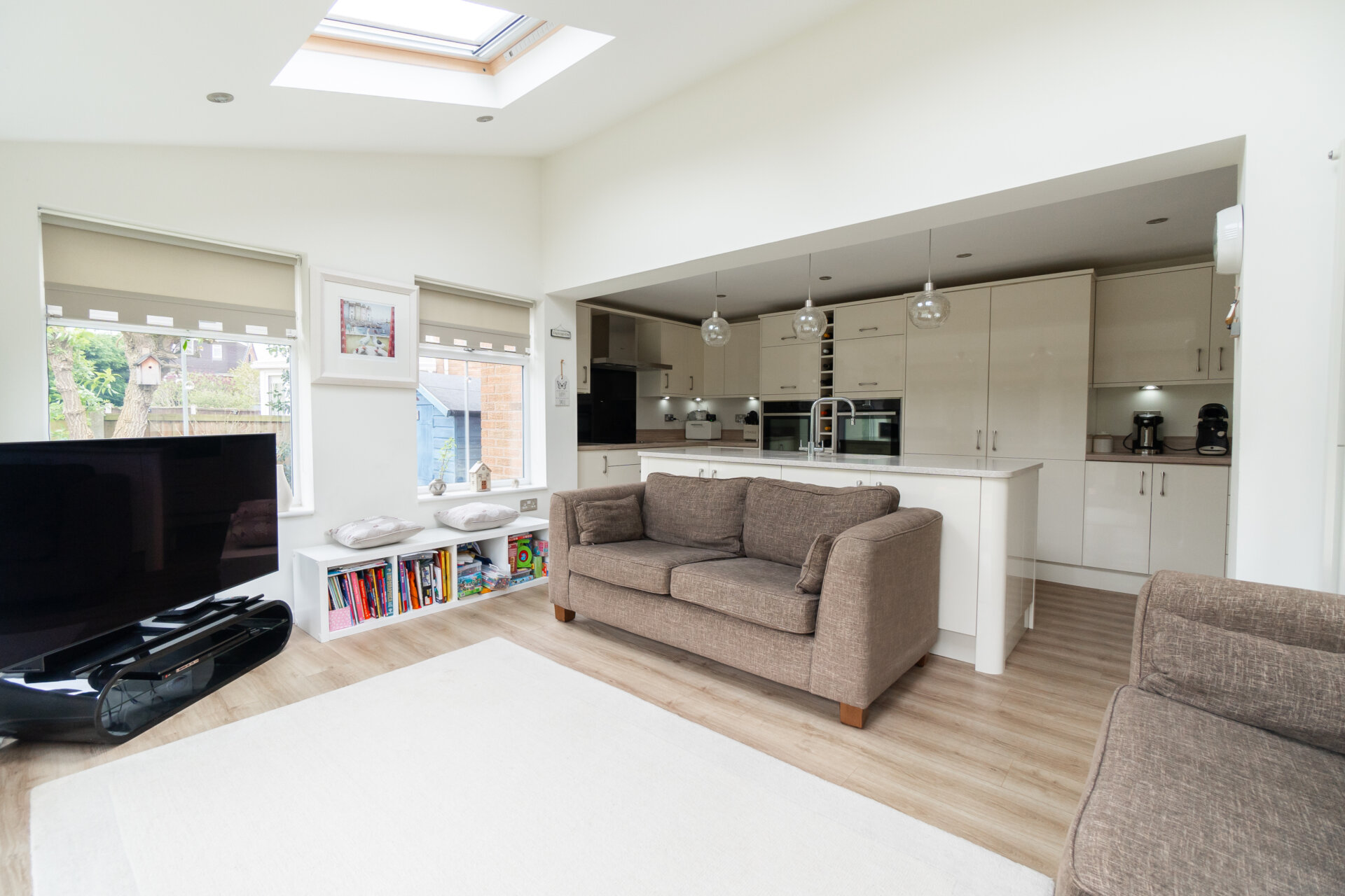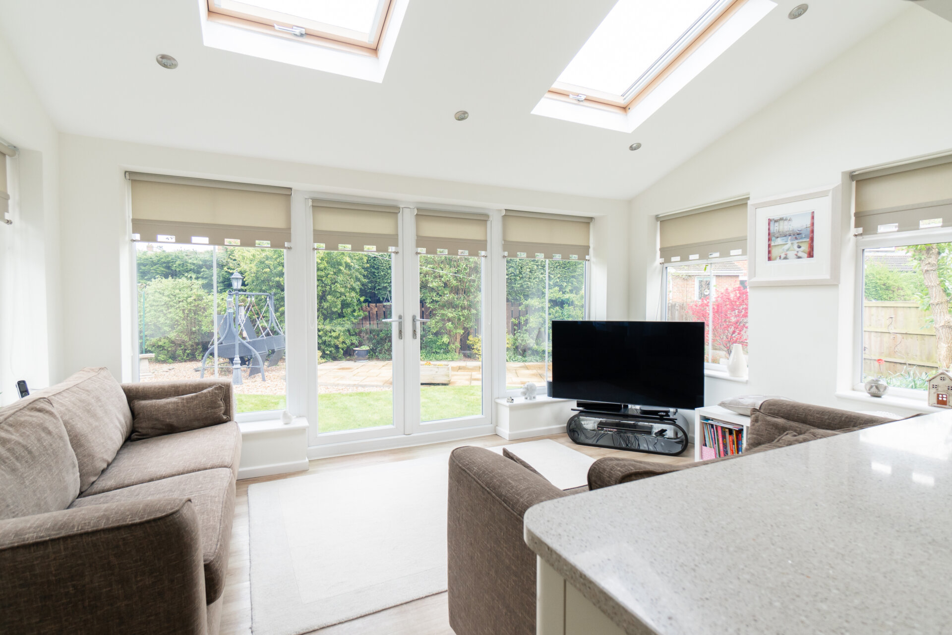 Living Area - two velux windows, UPVC double glazed windows and French doors onto the rear garden, vertical modern radiator, x2 TV points.
