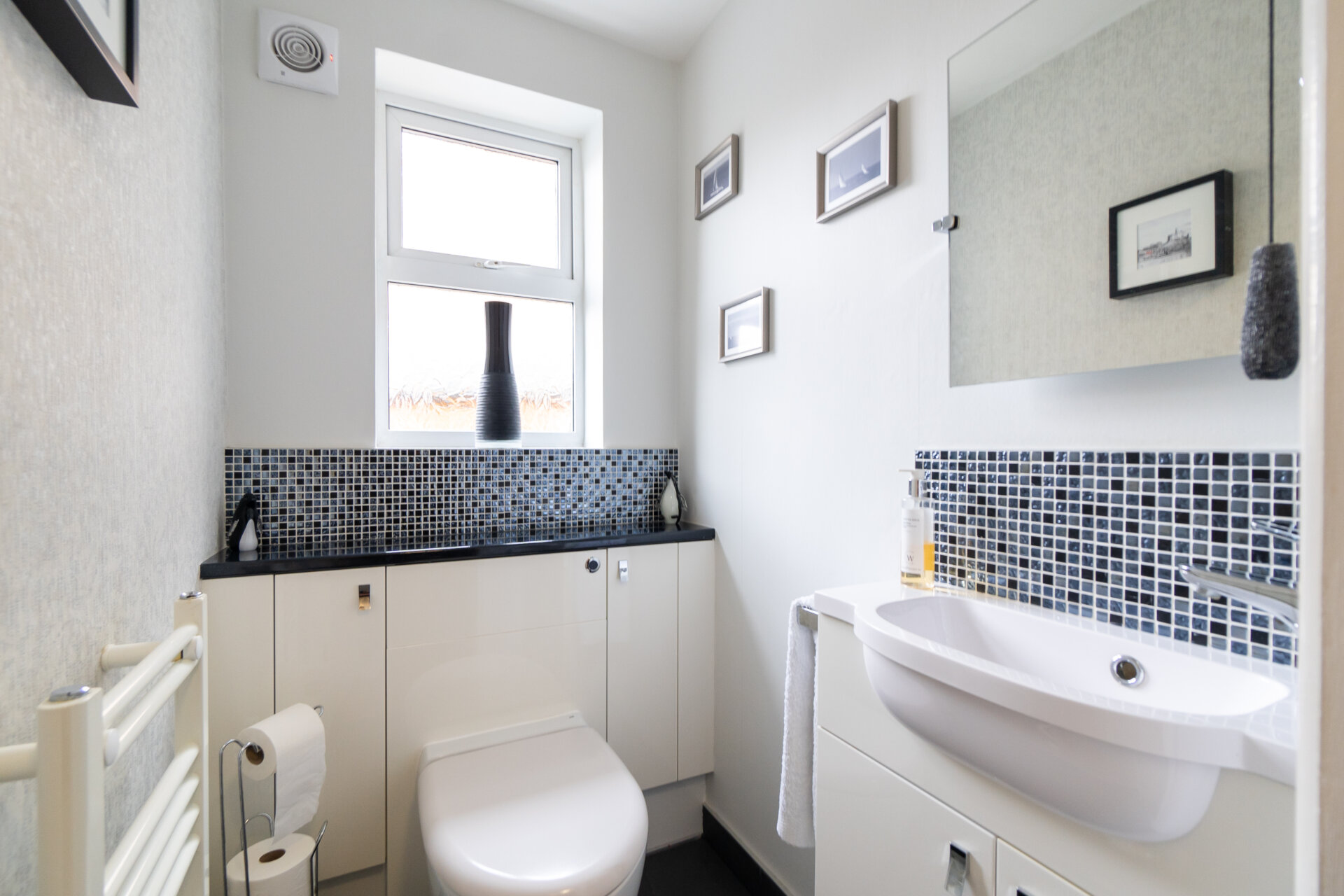 Low flush WC in a vanity unit offering storage, sink with storage underneath, UPVC double glazed window, heated towel rail and spotlights.
