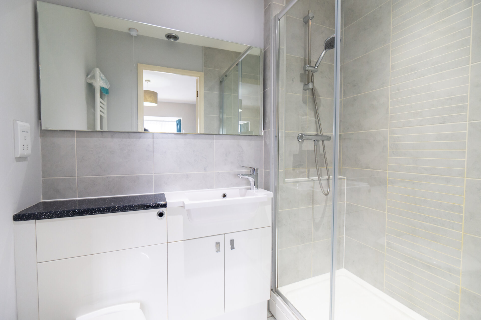 Walk-in shower cubicle with shower from the mains, vanity unit with wc, sink and storage, tiled walls and splashbacks, spot lights, extractor fan, heated towel rail
