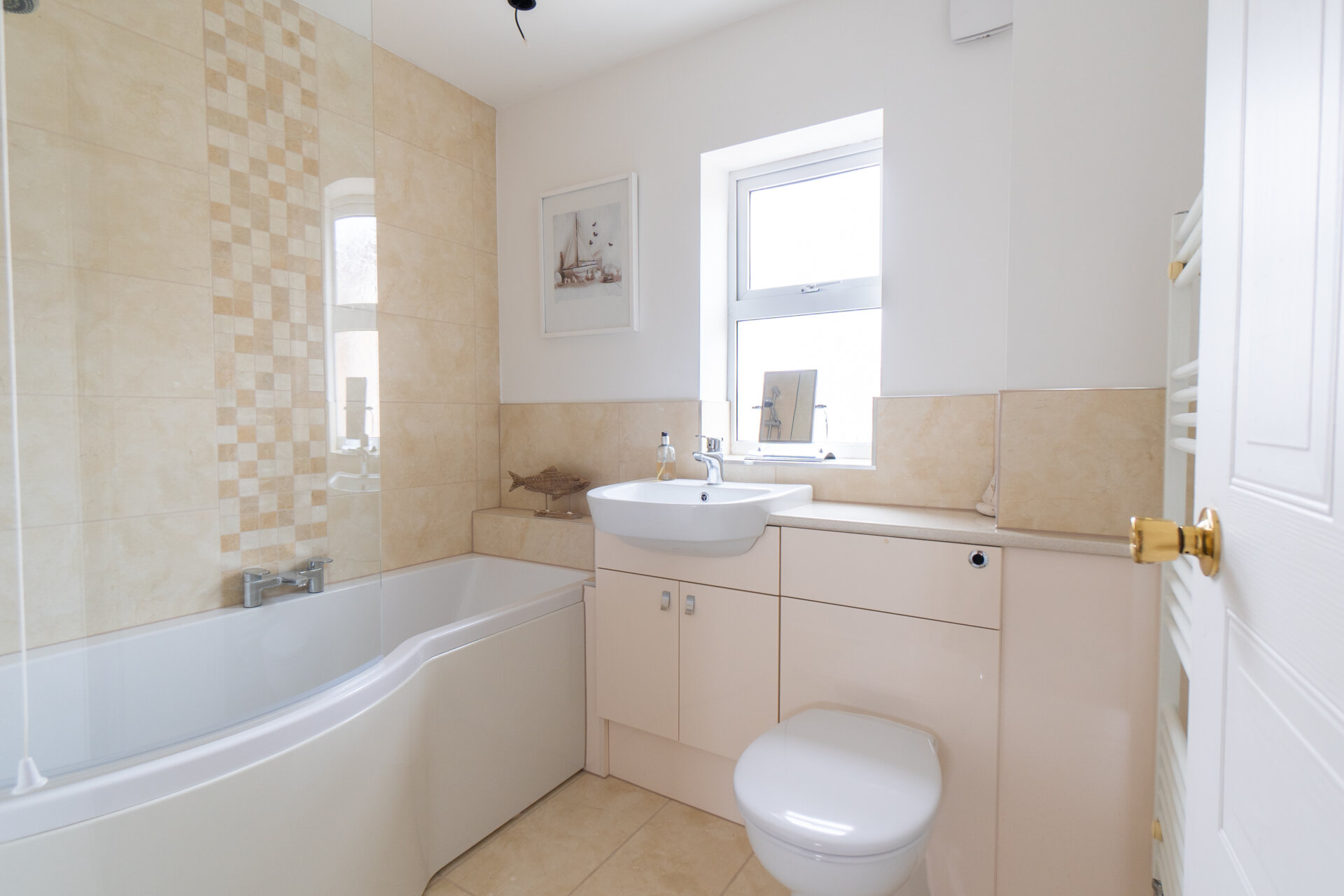 P-shape bath with shower over, vanity unit with wc, sink and storage, tiled walls and splahbacks, heated towel rail, UPVC double glazed window to the side, tiled floor, spotlights, extractor fan.