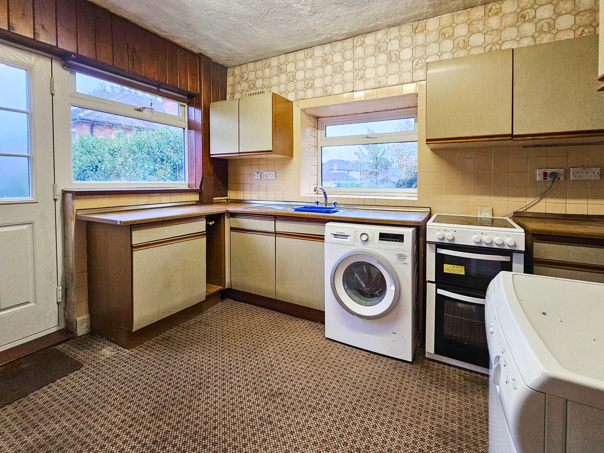 A range of wall and base units, with roll top work surfaces, inset sink and drainer with mixer tap over, space for washing machine, cooker and dryer, wall mounted combination boiler, double glazed window to the left and the rear elevation, radiator, pantry and door to the left elevation.