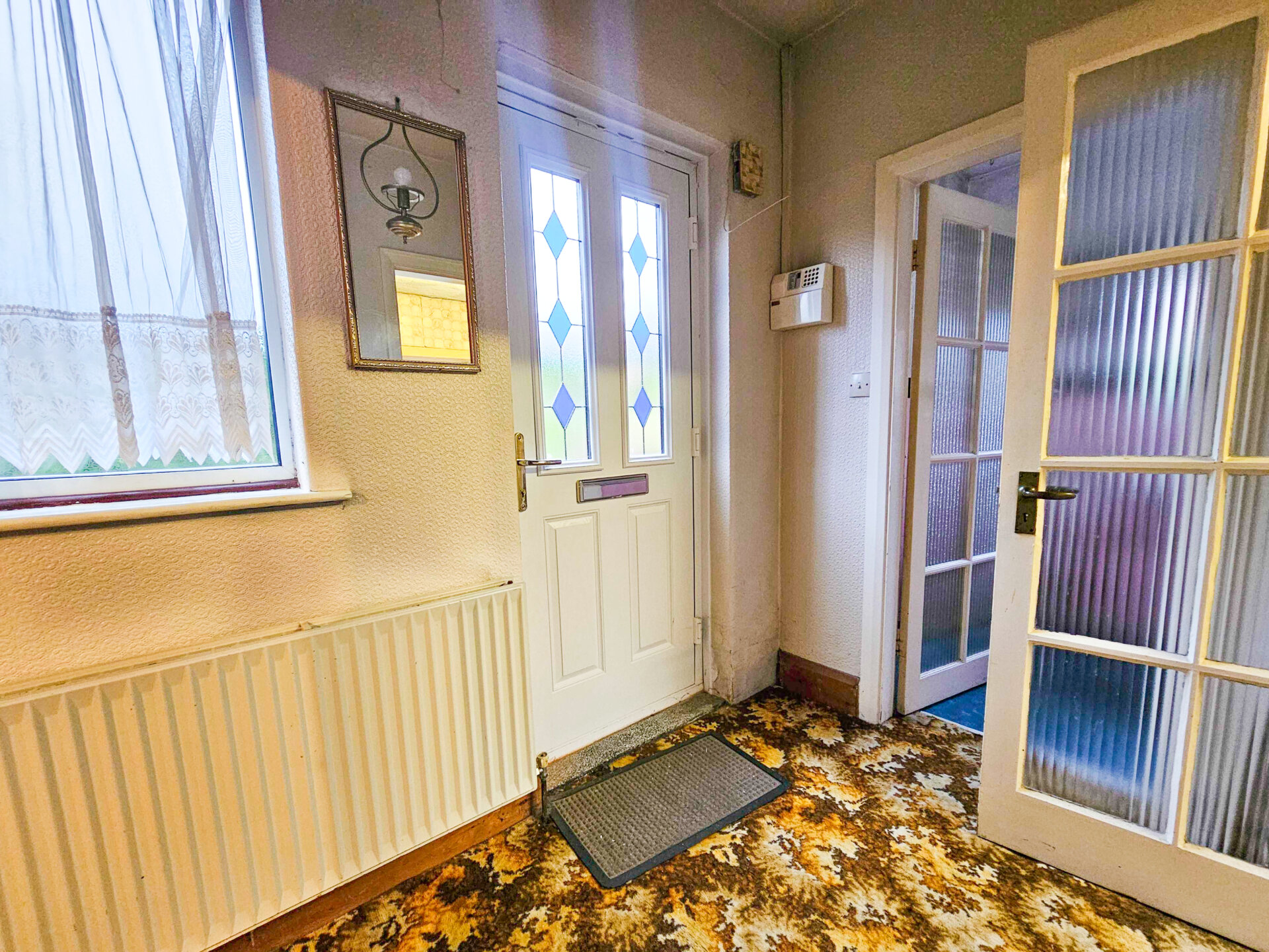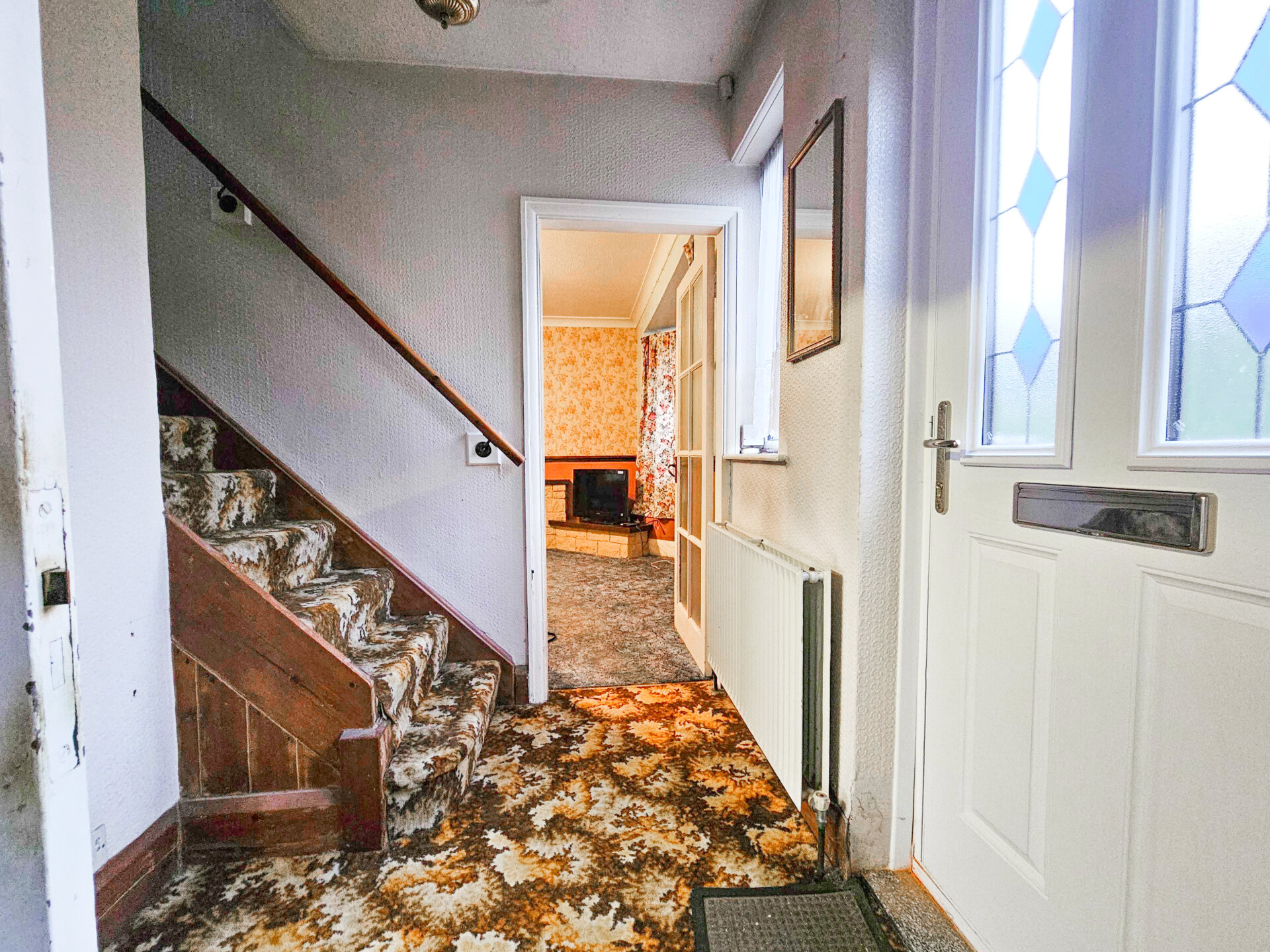 Double glazed door to enter, radiator, carpet flooring, double glazed window to the front elevation and stairs ascending.