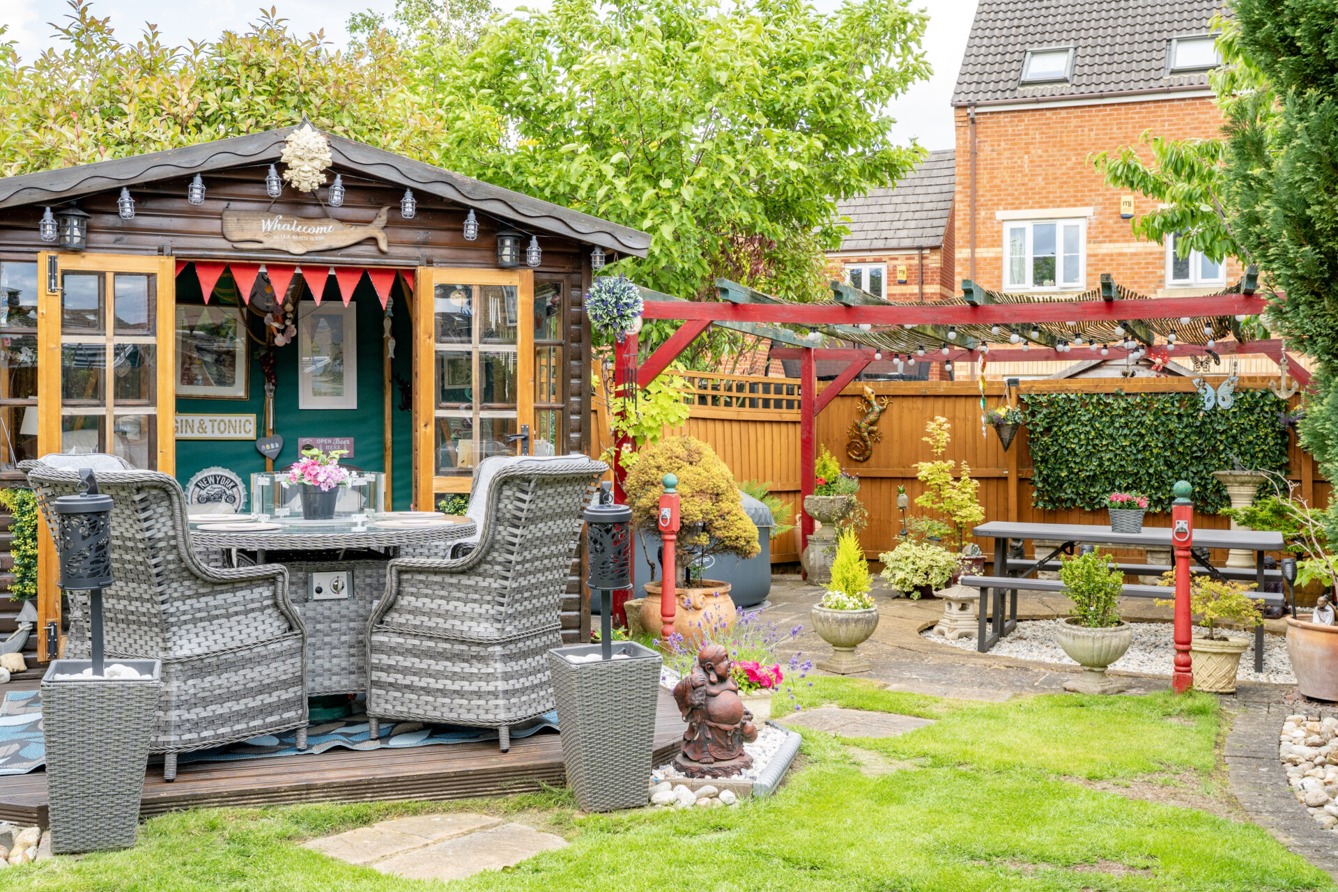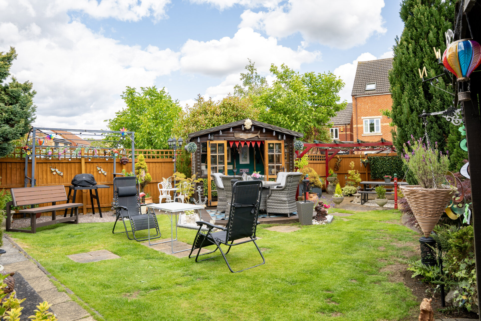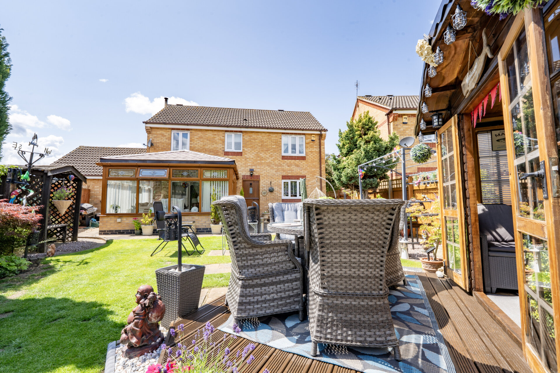 Outside, the property truly shines with its picturesque outdoor space. The front garden features a well-maintained lawn flanked by colourful borders teeming with flowers and shrubs, leading to the inviting entrance. A gate on the left elevation reveals the expansive rear garden, offering multiple secluded seating areas enclosed by fenced boundaries. A delightful patio area seamlessly transitions to a lush lawn, while a centrally located decking provides access to the charming summer house. At the end of the garden, a secluded patio with a pergola awaits, perfect for outdoor gatherings. To the right side of the property lies a sizeable storage area, leading to the back of the double garage. This garage comes equipped with light, power, and a rear door granting direct access to the garden. Completing the outdoor amenities are raised beds, a tranquil water feature, and a convenient outside tap. With off-road parking for two cars on the tar macadam driveway, this property is a rare find that seamlessly combines indoor comfort with outdoor tranquillity.