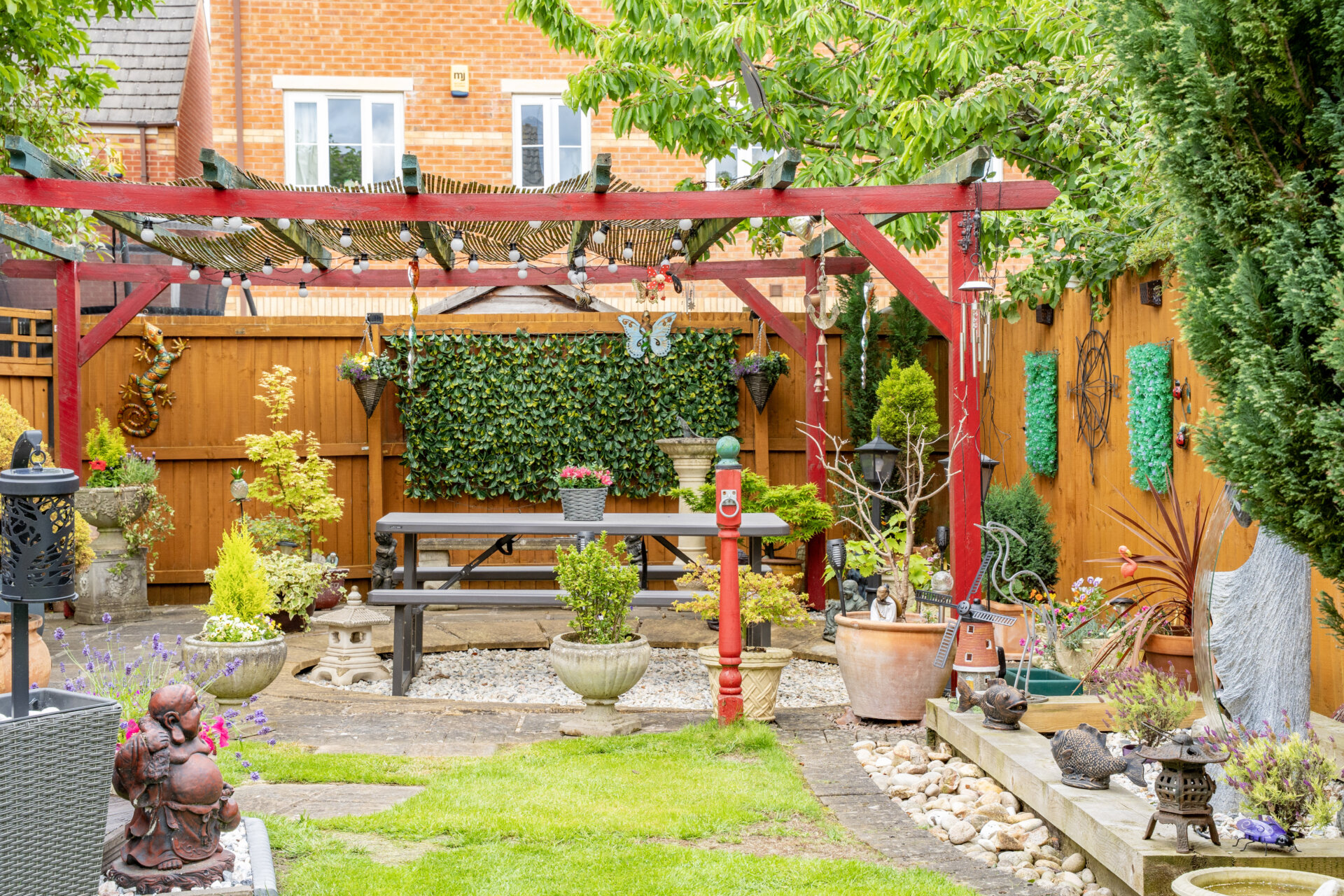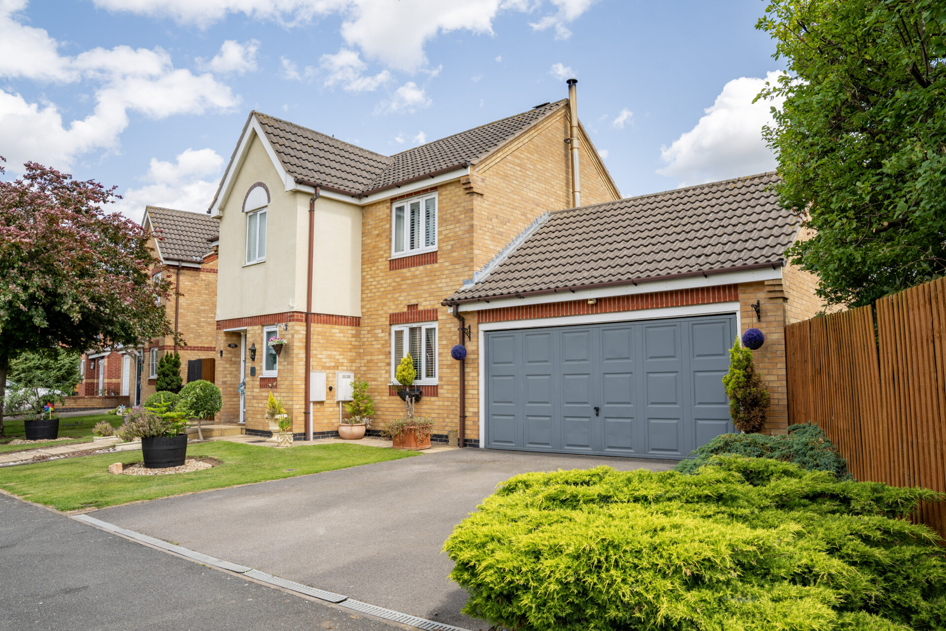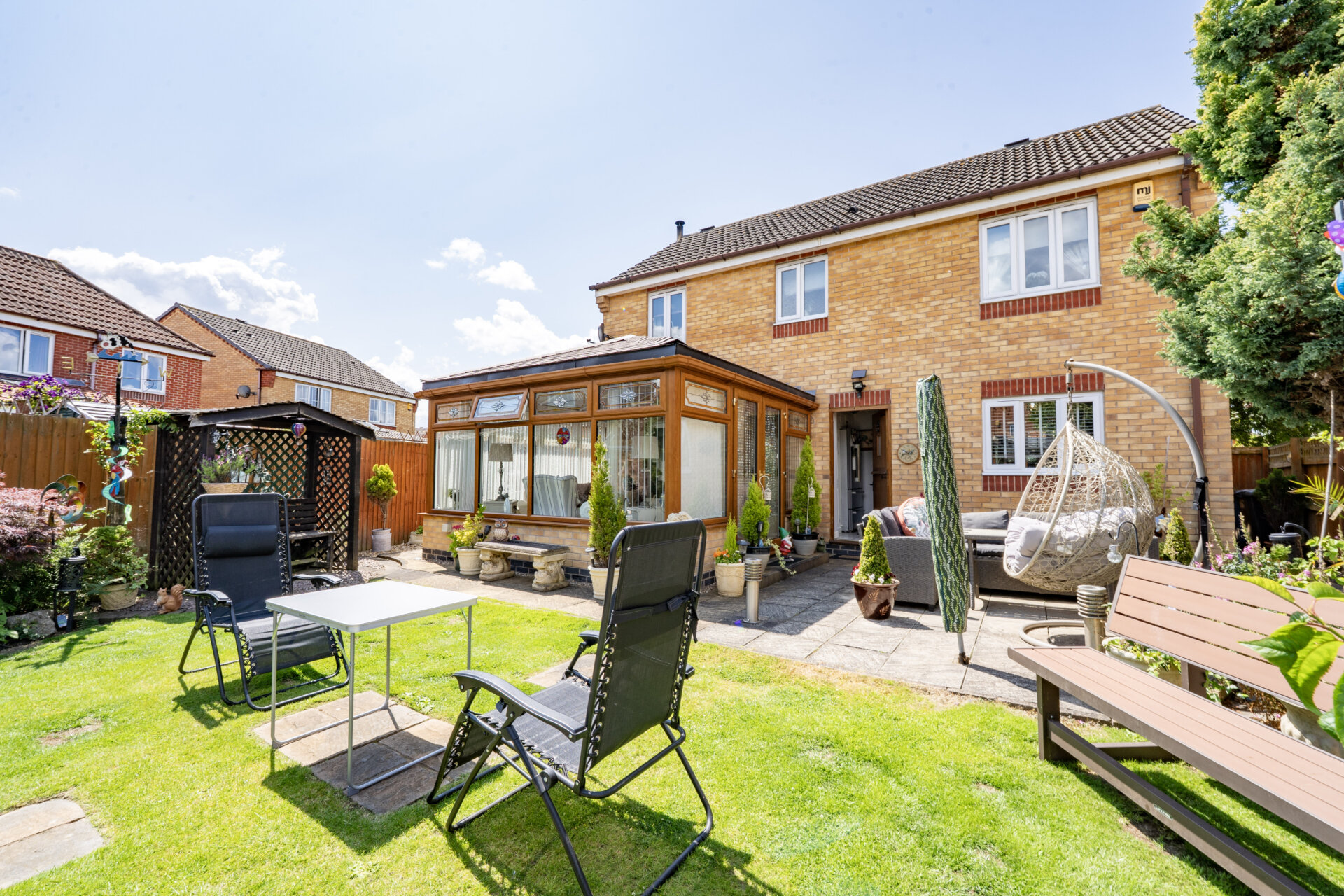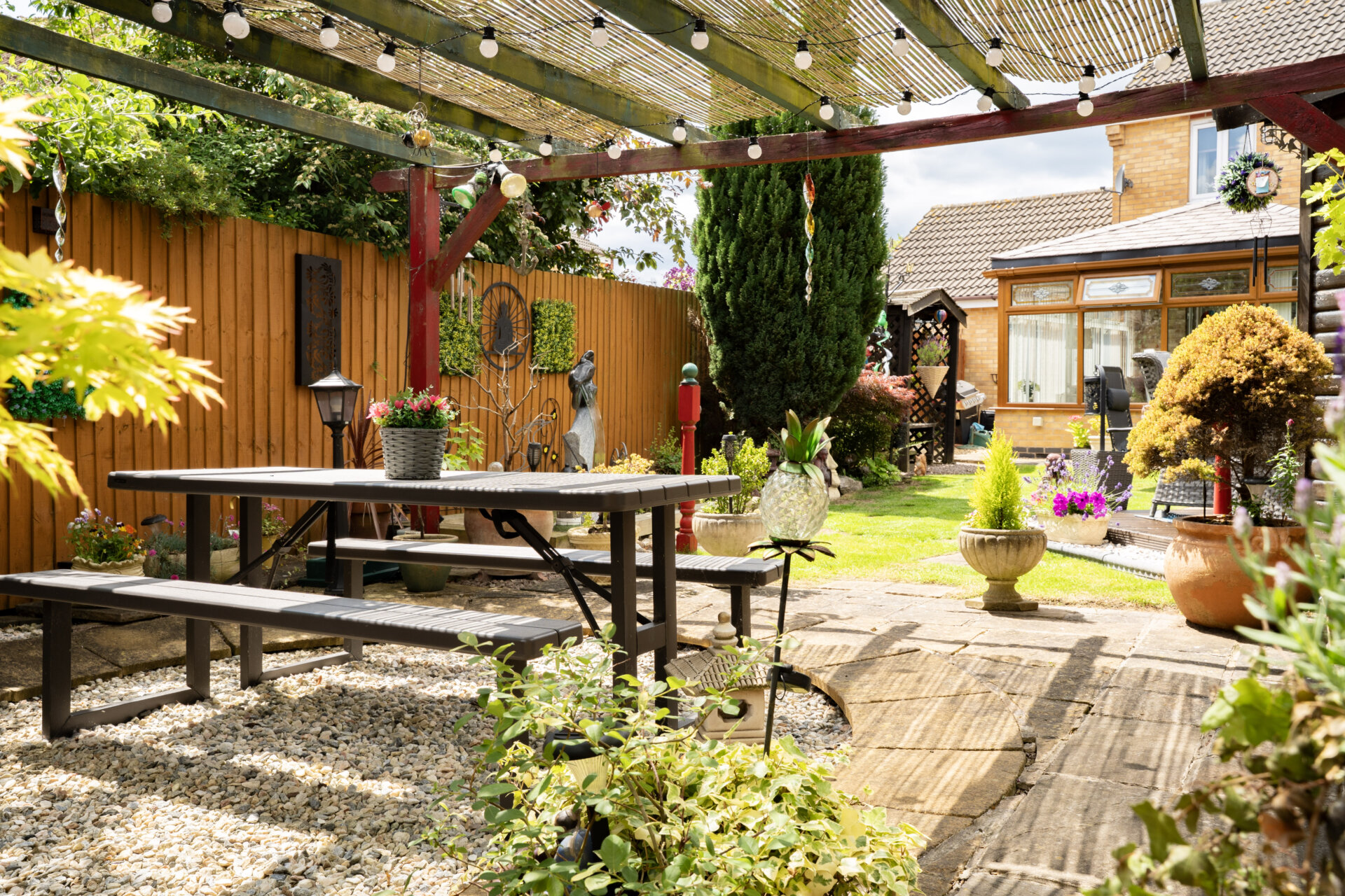Outside, the property truly shines with its picturesque outdoor space. The front garden features a well-maintained lawn flanked by colourful borders teeming with flowers and shrubs, leading to the inviting entrance. A gate on the left elevation reveals the expansive rear garden, offering multiple secluded seating areas enclosed by fenced boundaries. A delightful patio area seamlessly transitions to a lush lawn, while a centrally located decking provides access to the charming summer house. At the end of the garden, a secluded patio with a pergola awaits, perfect for outdoor gatherings. To the right side of the property lies a sizeable storage area, leading to the back of the double garage. This garage comes equipped with light, power, and a rear door granting direct access to the garden. Completing the outdoor amenities are raised beds, a tranquil water feature, and a convenient outside tap. With off-road parking for two cars on the tar macadam driveway, this property is a rare find that seamlessly combines indoor comfort with outdoor tranquillity.