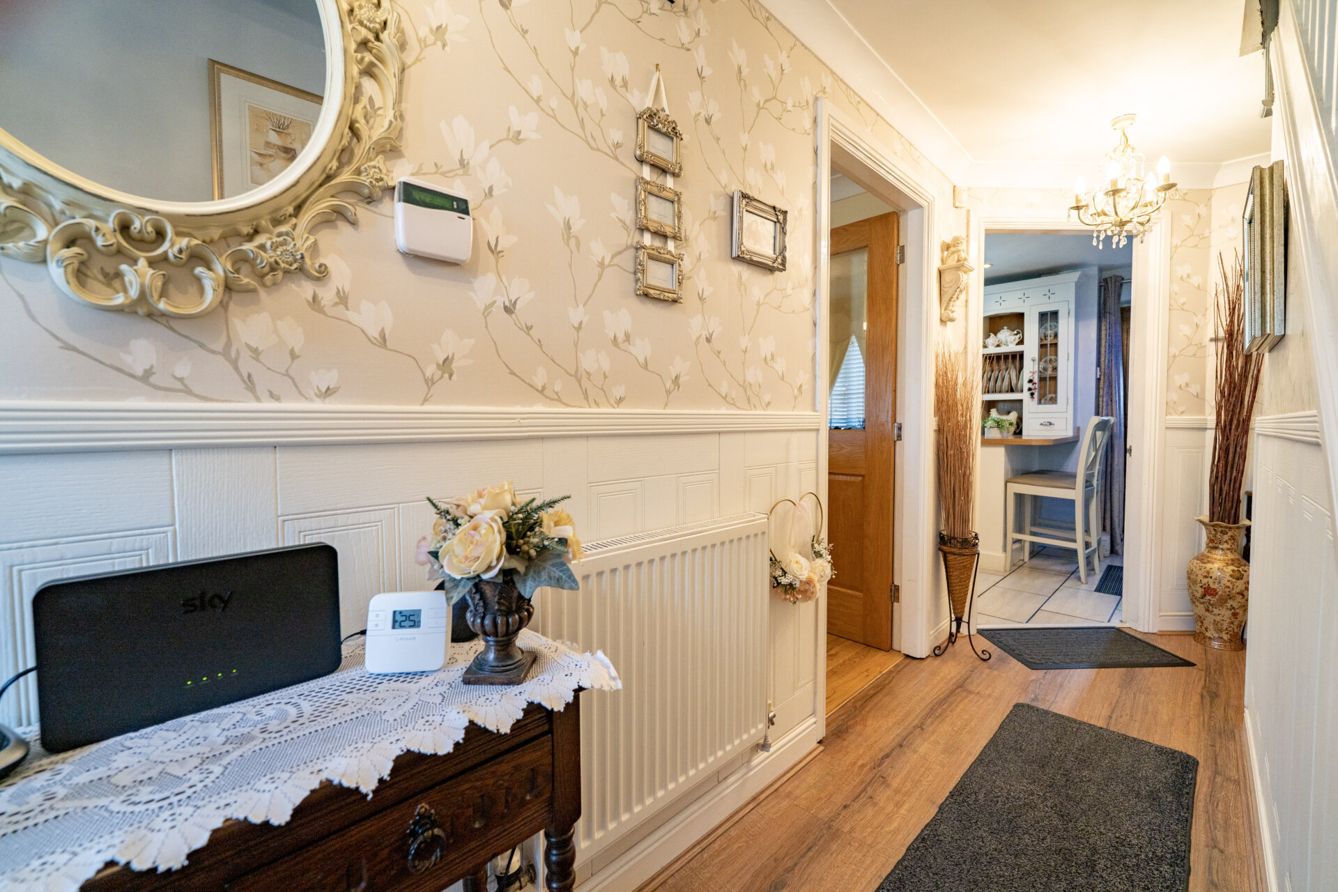 Composite front entrance door, laminate floor, stairs to the first floor landing, radiator, wood panelling to the walls, coving to the ceilings, door to understairs storage cupboard and doors to