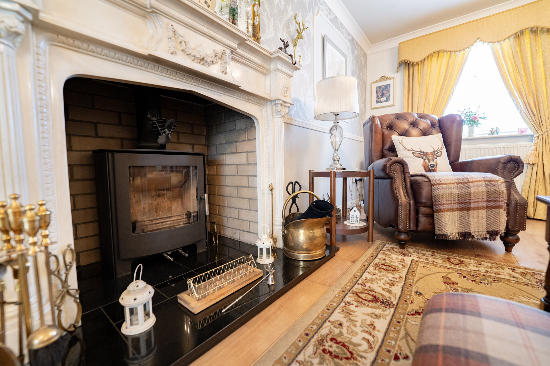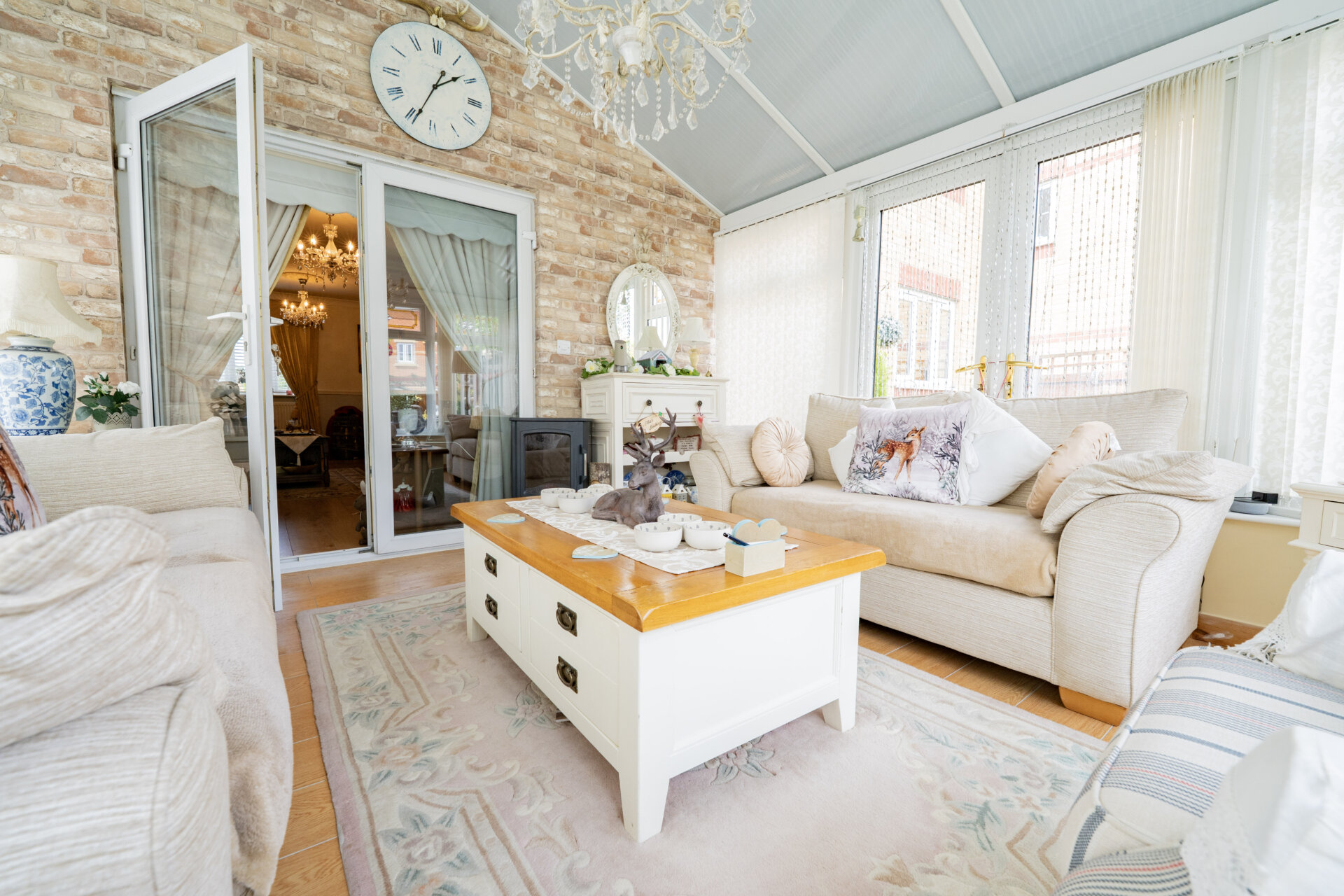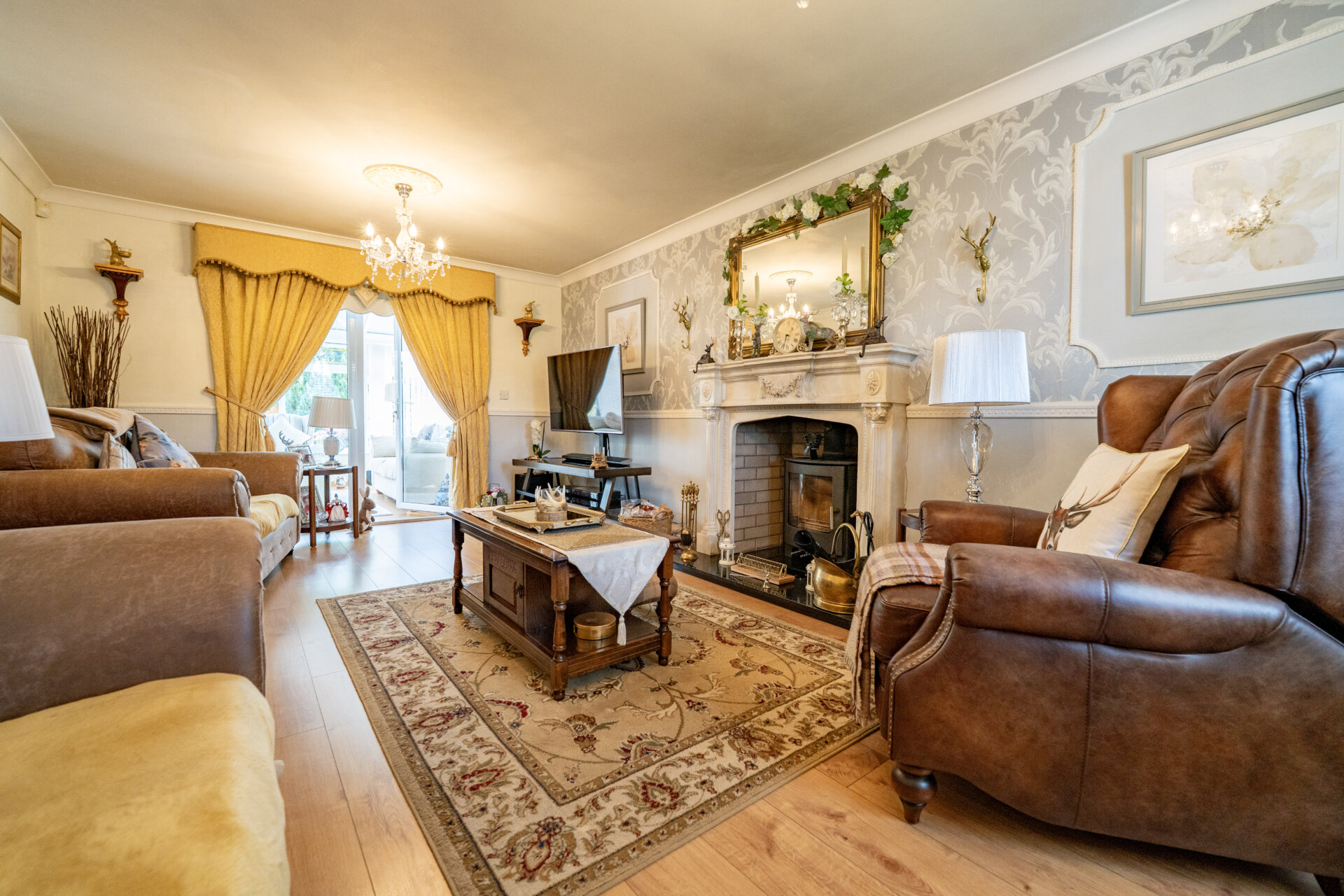 UPVC double glazed window to the front, coving to the ceiling, dado rail, laminate floor, log burner with Adam style surround and tiled hearth, UPVC double glazed French Doors to the conservatory, x2 radiators and TV point.