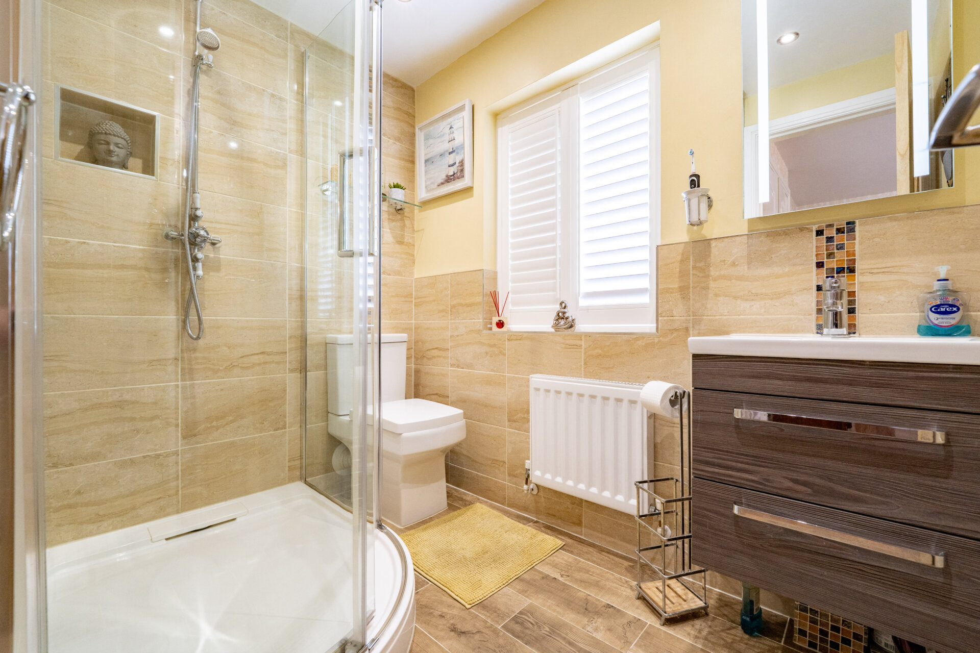 Walk-in shower cubicle with shower from the mains, sink with storage, low flush w.c, fully tiled walls and splashbacks, tiled floor, UPVC double glazed window with shutters, spotlights, extractor fan, radiator.