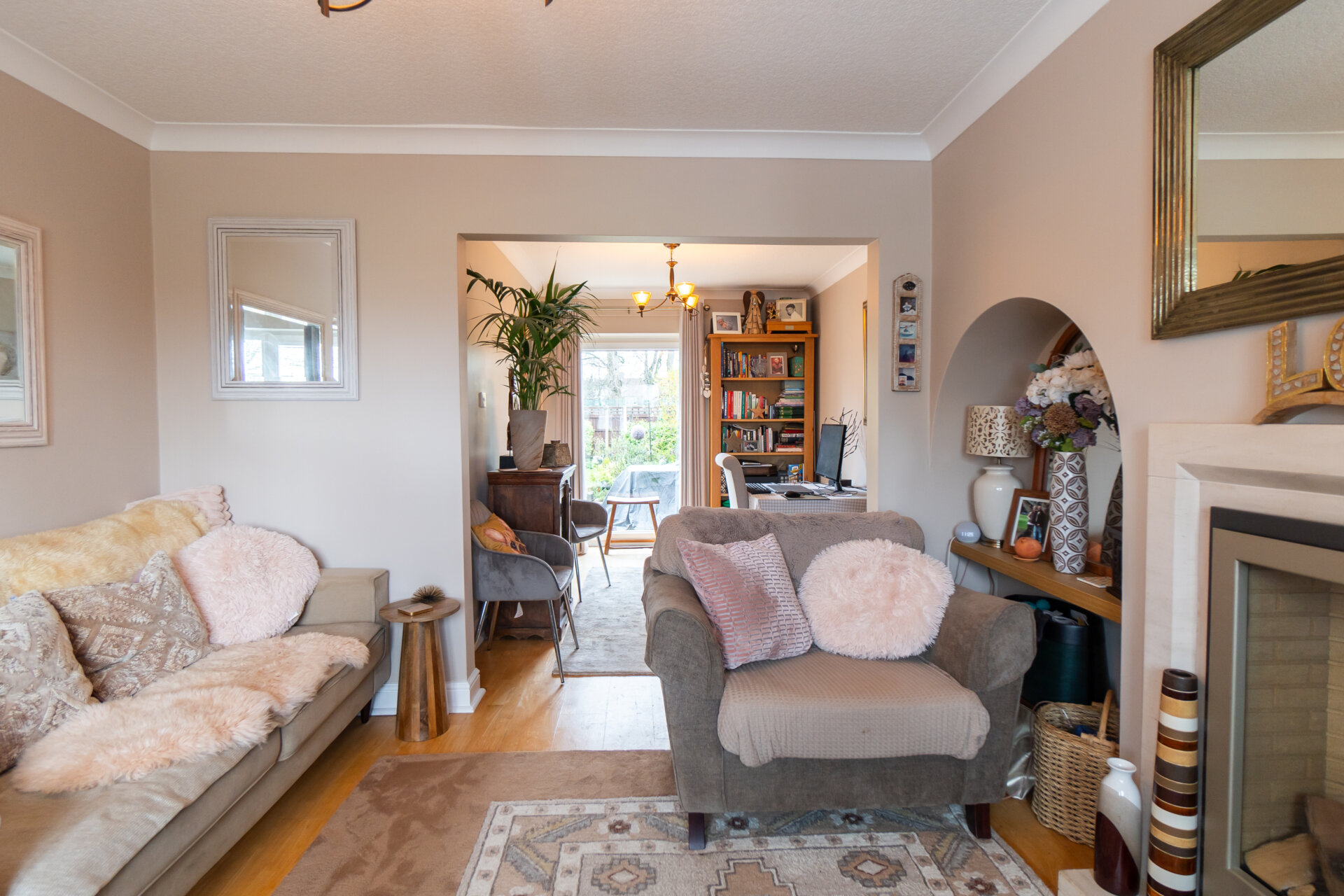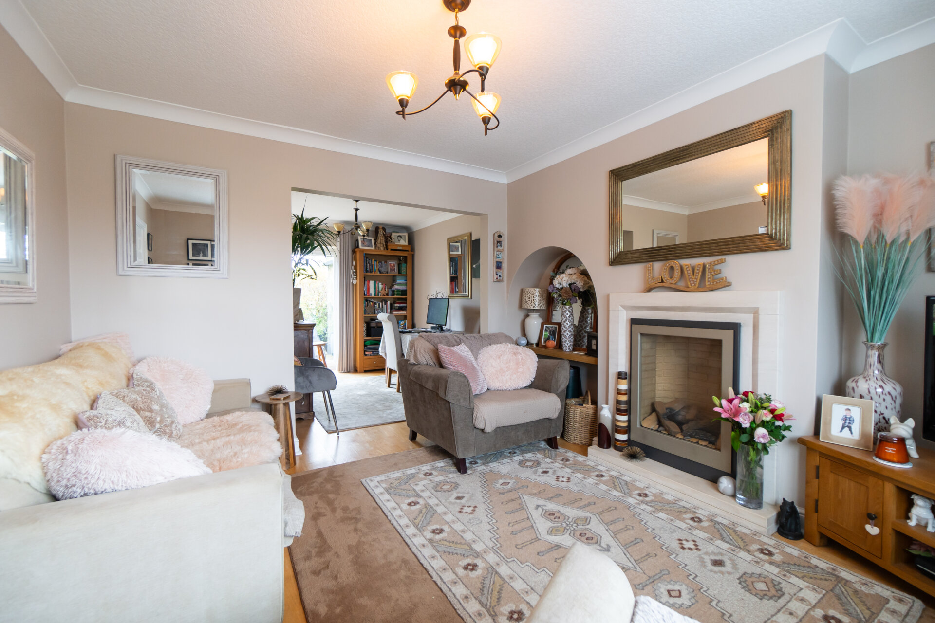 UPVC double glazed window to the front with blinds, gas fir with Marble surround and hearth, coving to the ceiling, radiator, solid wood floor and open to the