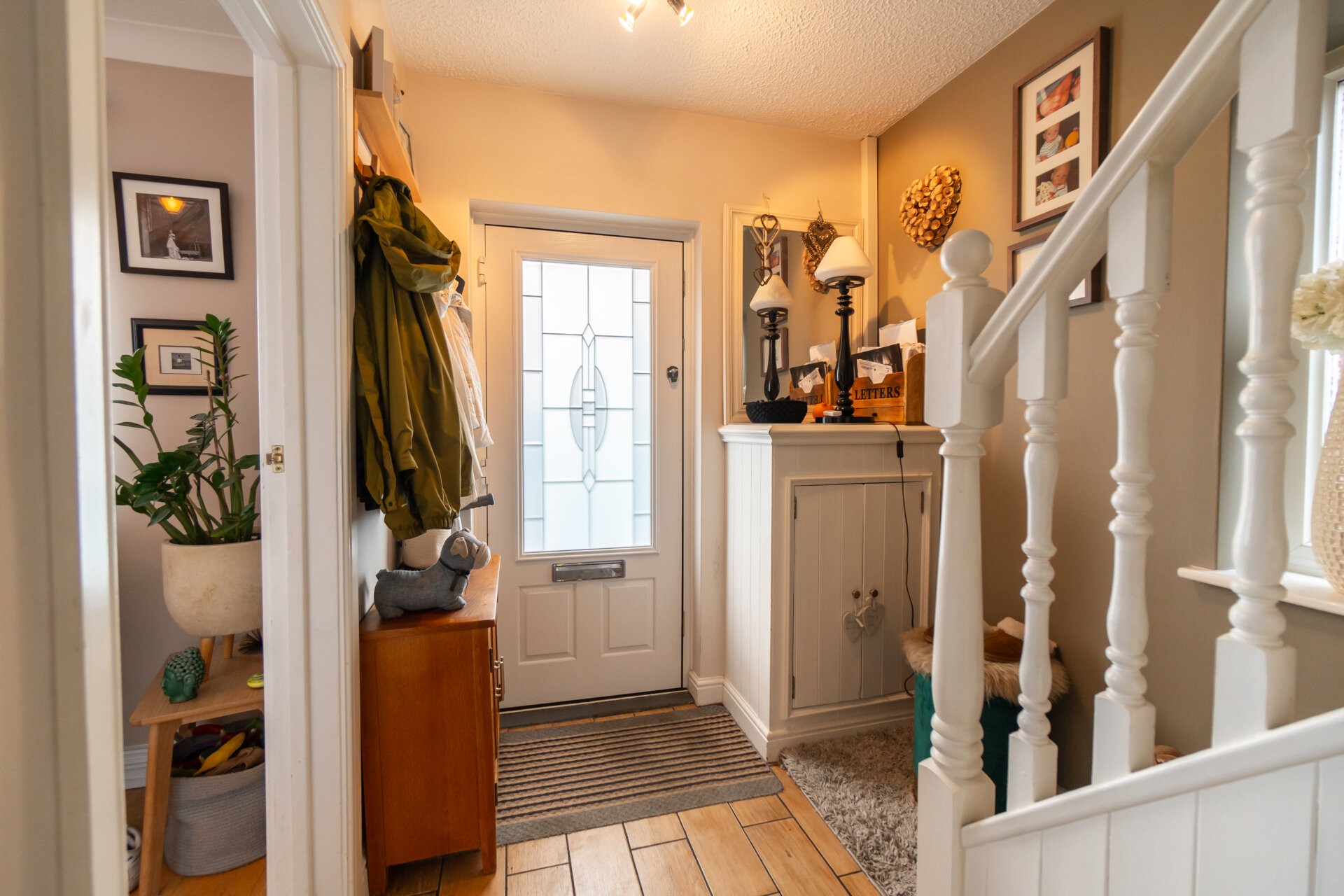 Composite front entrance door, stairs to the first floor landing, storage cupboard under the stairs, radiator and door to