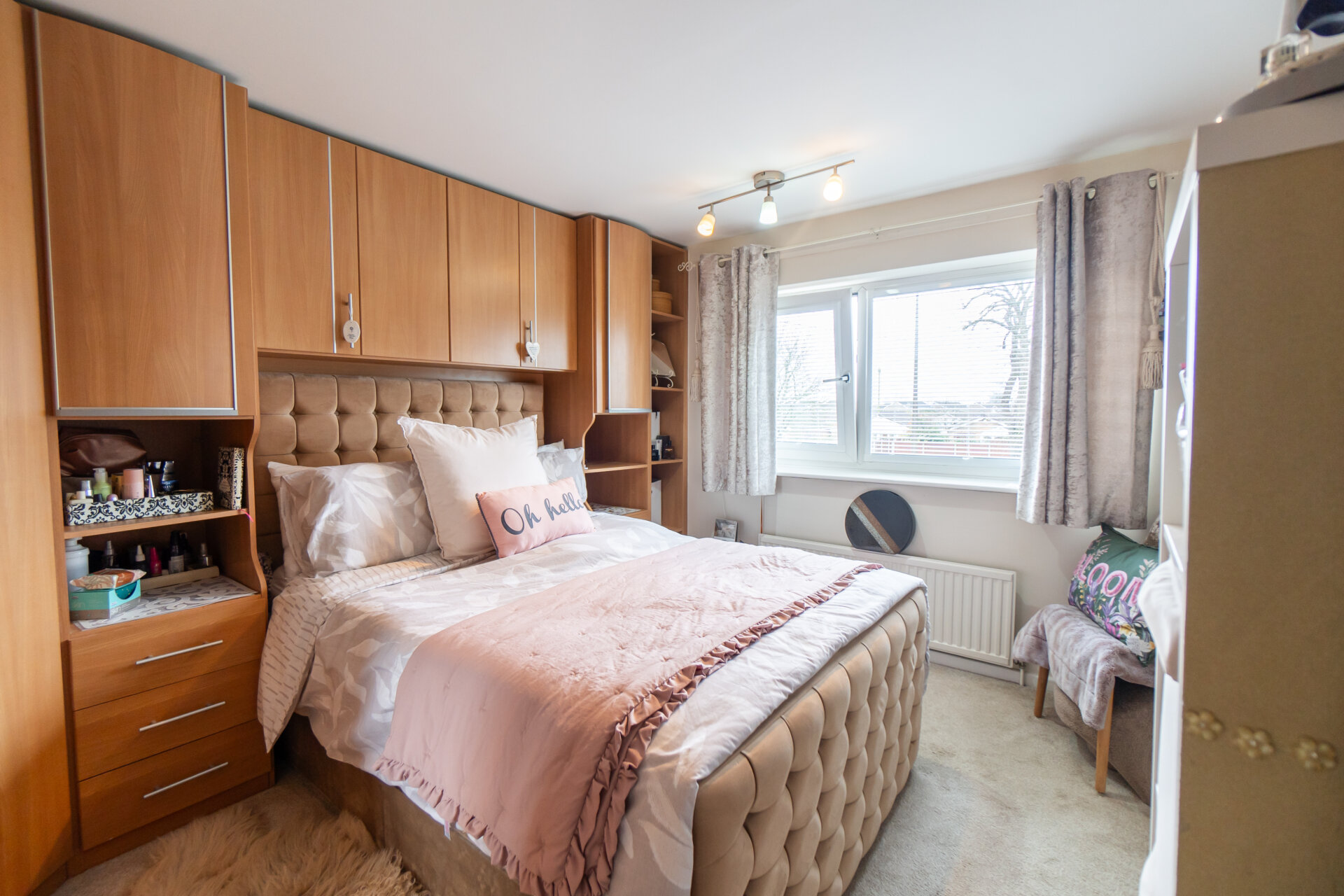 UPVC double glazed window to the front with blinds, built-in storage and radiator