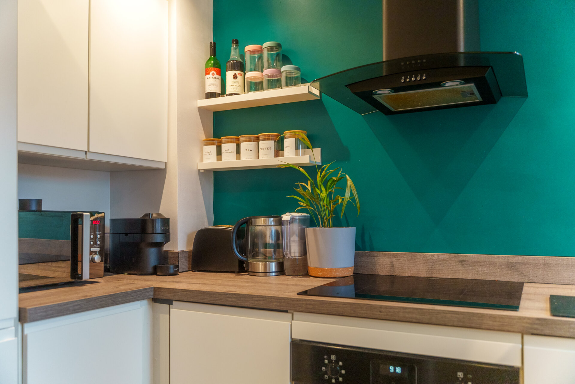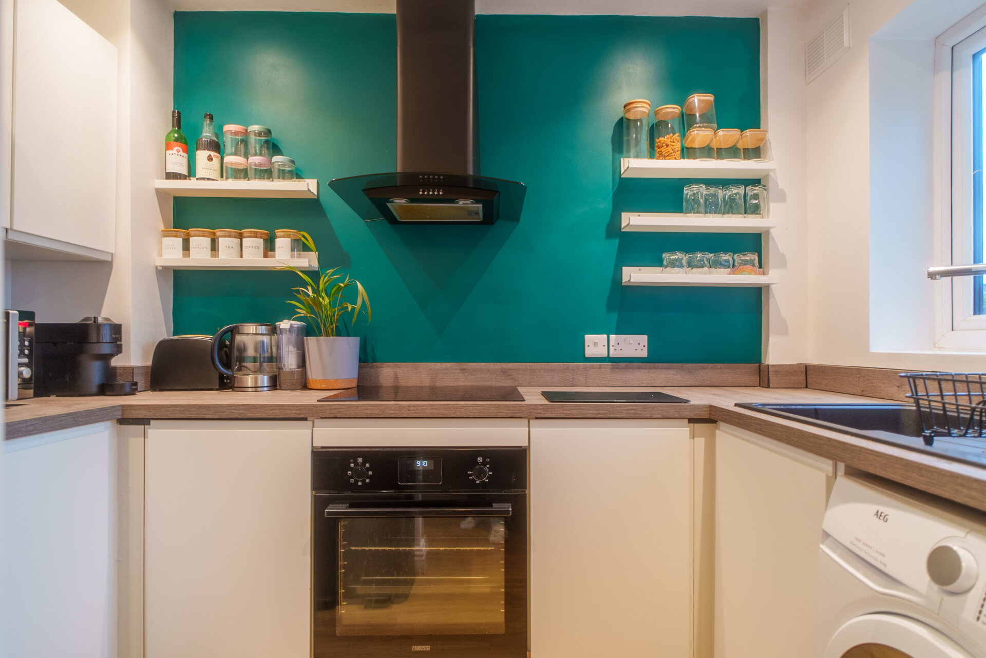 A newly fitted kitchen from Wren comprising, wall, base and drawer units with work surface over, sink and drainer unit with Swan mixer tap over, splashbacks, built-in fridge/freezer, oven, induction hob and extractor hood over, plumbing for automatic washing machine, vinyl tiled floor, UPVC double glazed window.