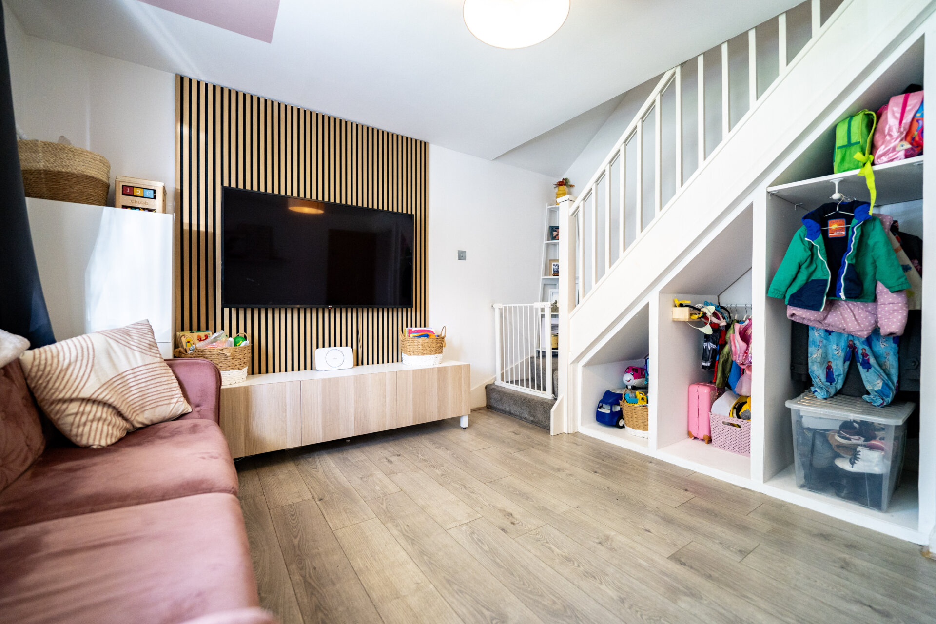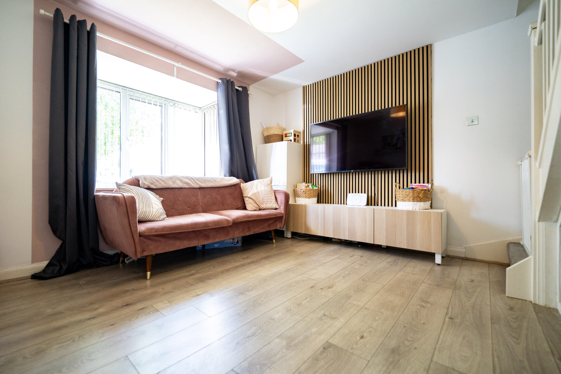 UPVC double glazed window to the front, laminate floor, radiator, stairs to the first floor landing