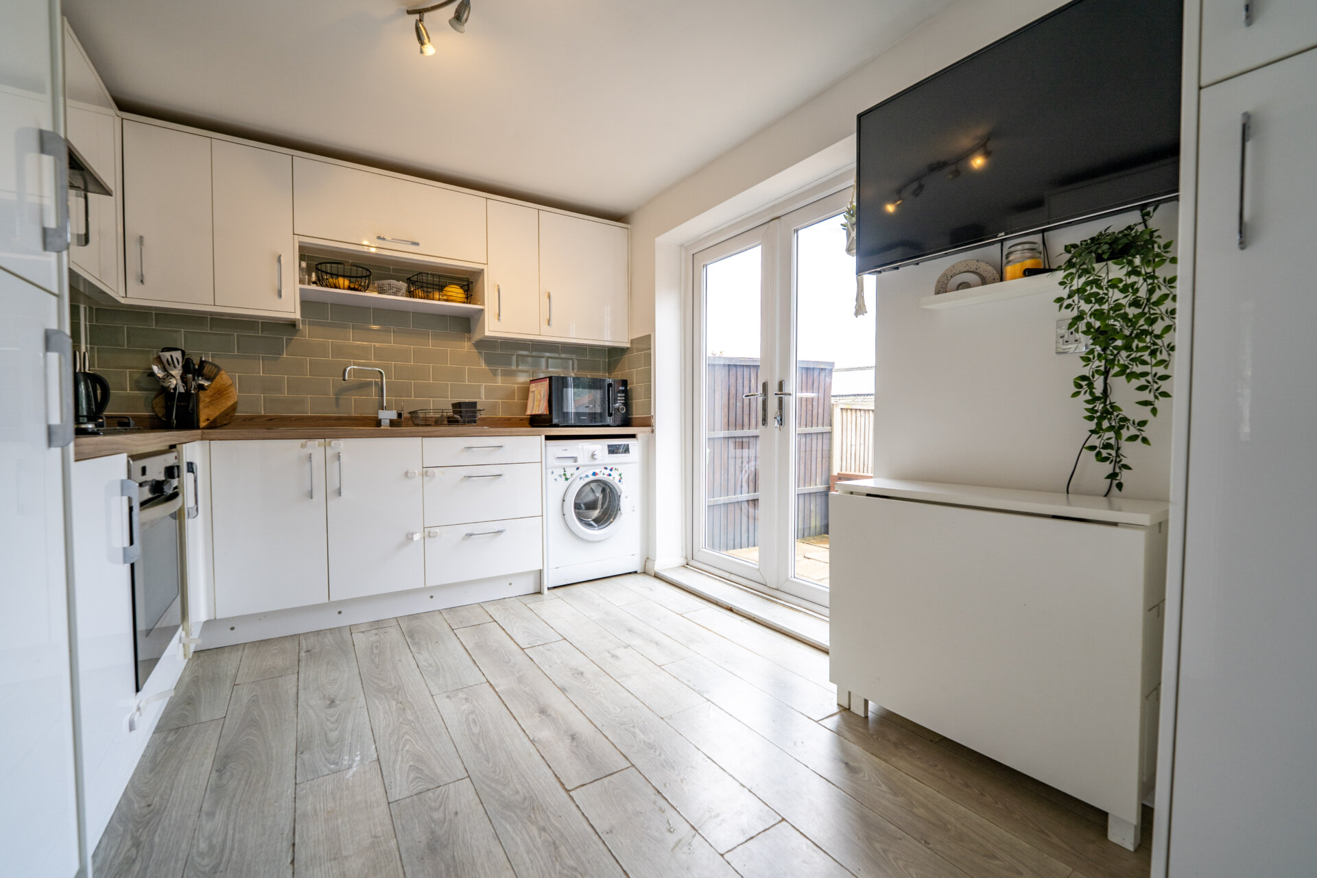 Wall, base and drawer units with work surface over, tiled walls and splashbacks, sink/waste/drainer unit with mixer tap over, built-in oven, gas hob and extractor hood over, built-in fridge/freezer, plumbing for automatic washing machine, laminate floor, radiator, UPVC double glazed patio doors to the rear, cupboard housing the gas central heating boiler.