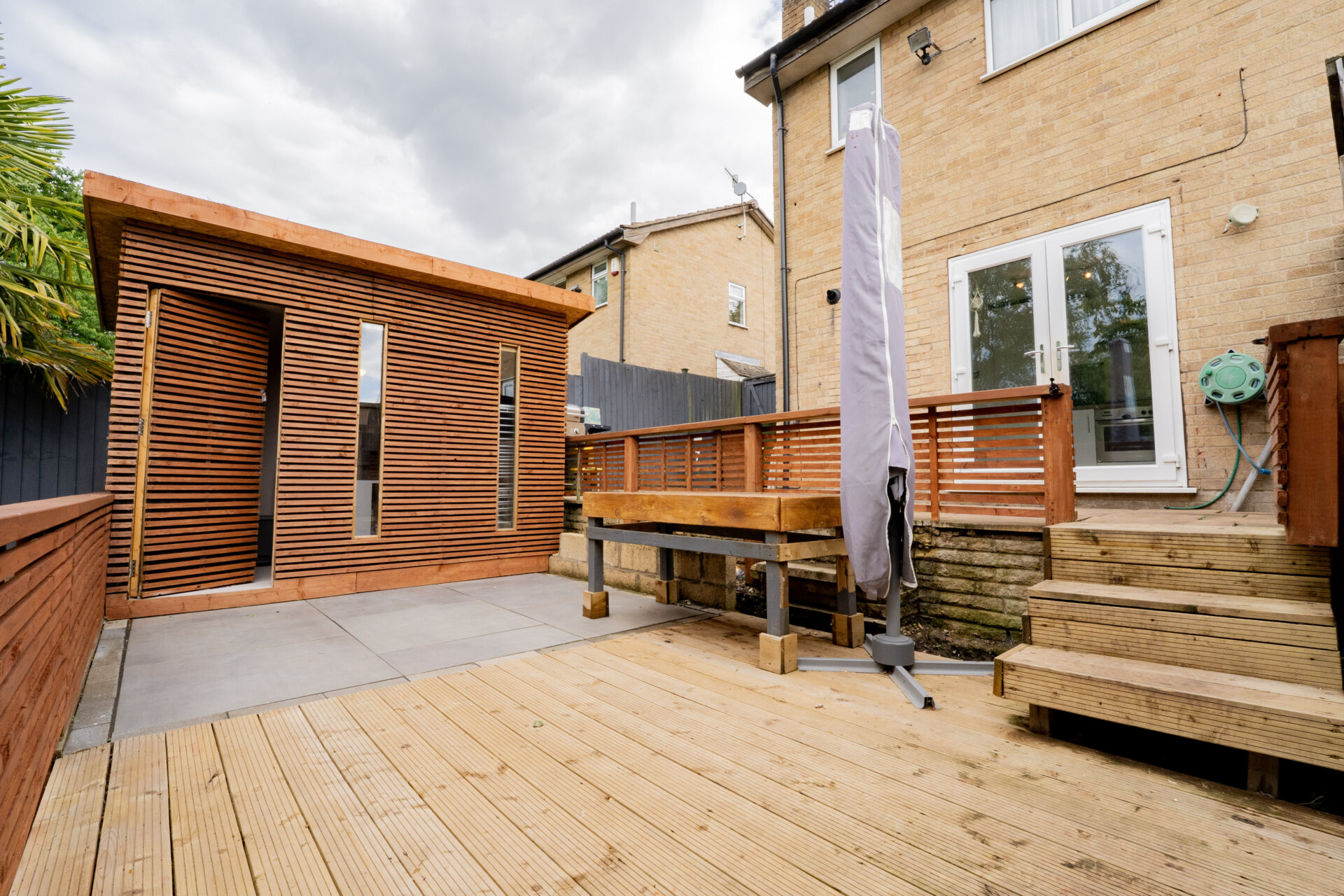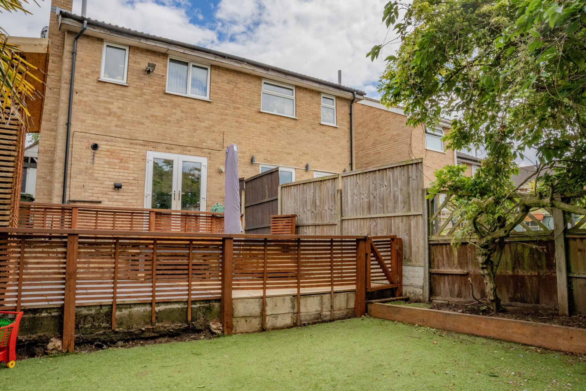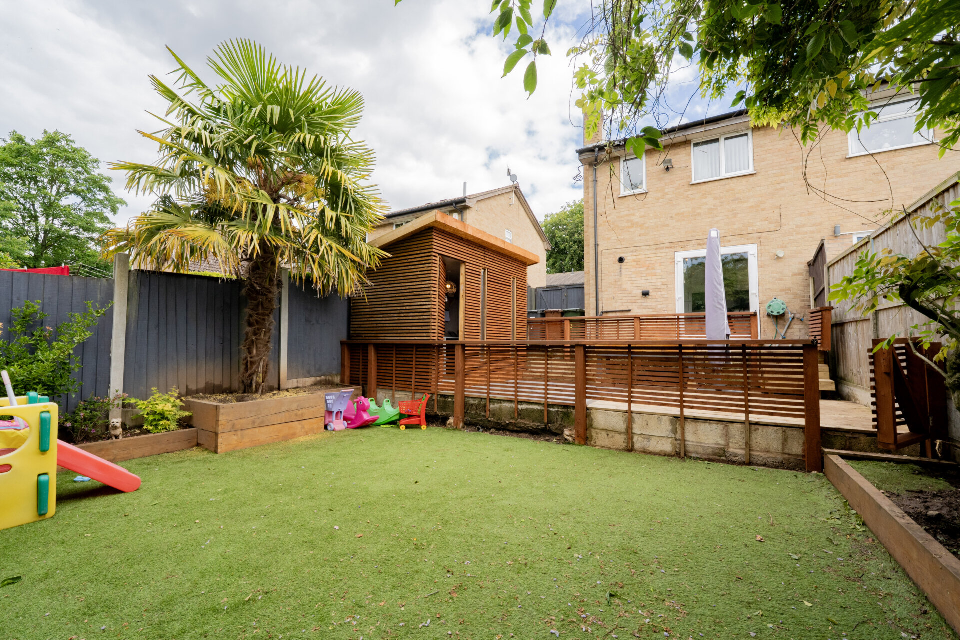 Outside, the property impresses with its meticulously landscaped outdoor space, designed to cater to a range of preferences. The front of the house features a well-kept lawn and off-road parking for two vehicles, perfect for those with multiple cars or visitors. A gate on the side elevation opens to reveal the rear garden, where a paved patio leads to an inviting decking area and a separate patio zone. A charming summer house beckons, complete with lighting and power. Further steps lead to an area featuring artificial grass, raised beds, and a garden shed, providing ample space for gardening enthusiasts or outdoor entertaining. The south-facing orientation of the garden ensures plenty of sunlight throughout the day.
