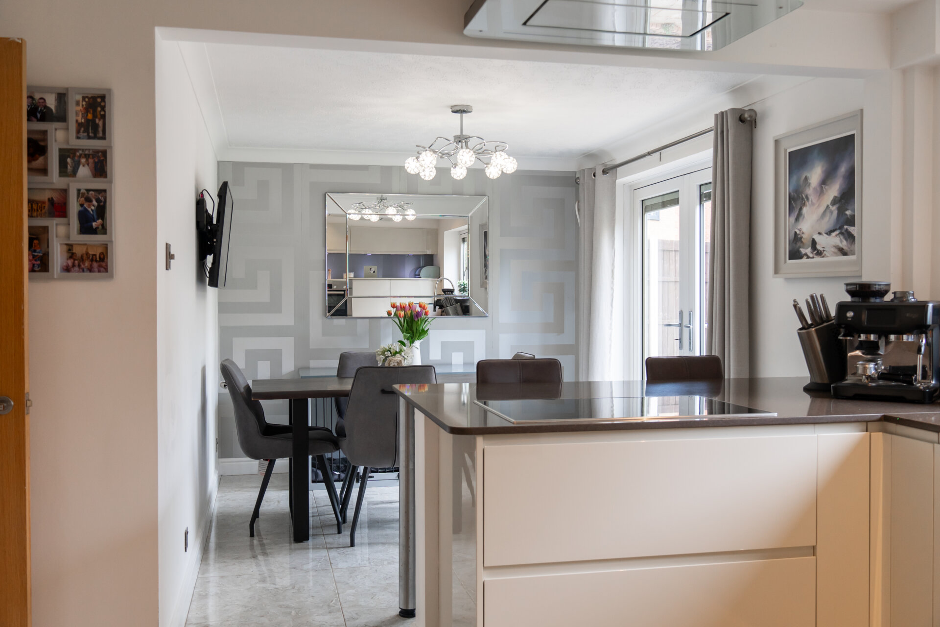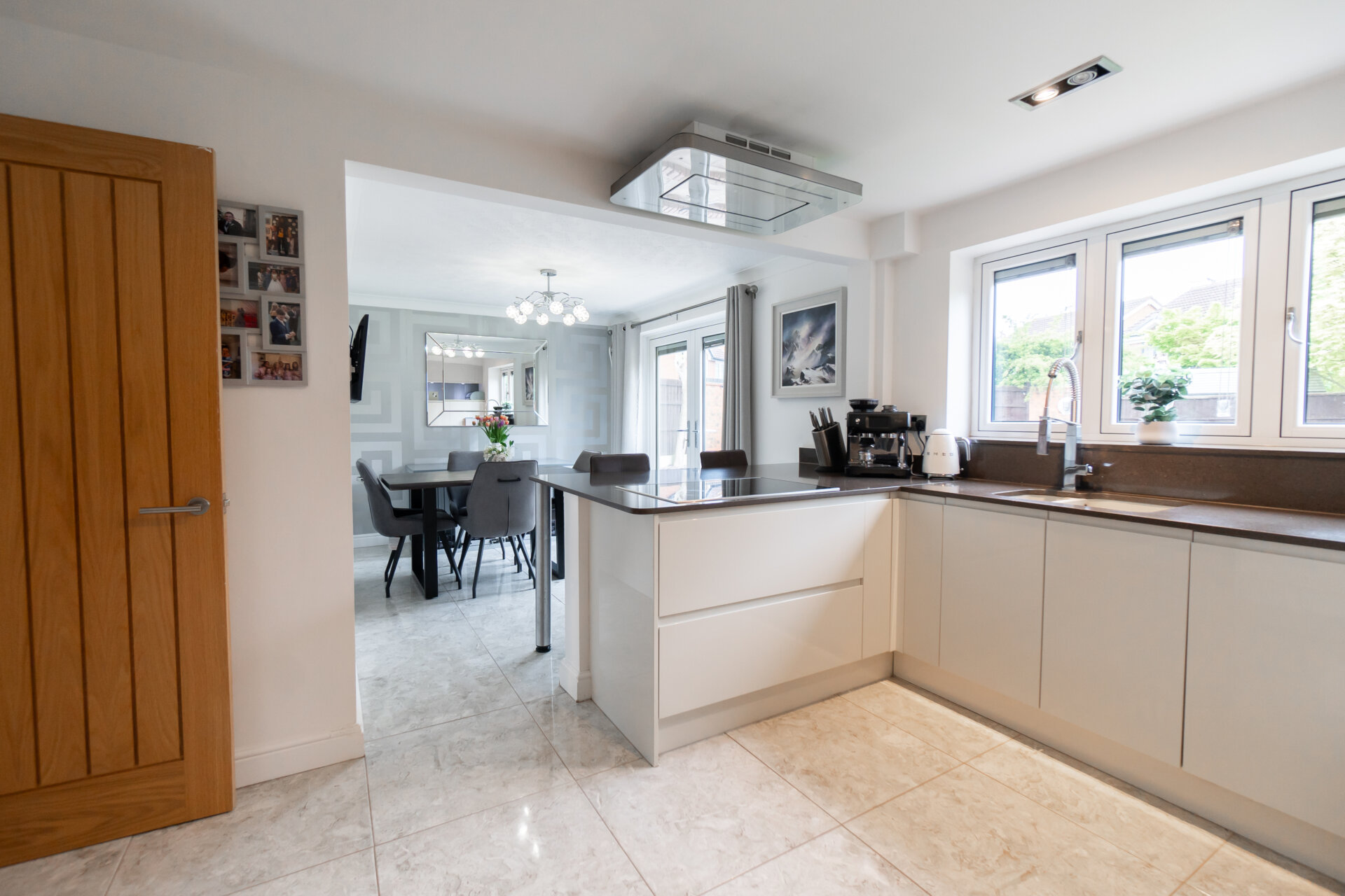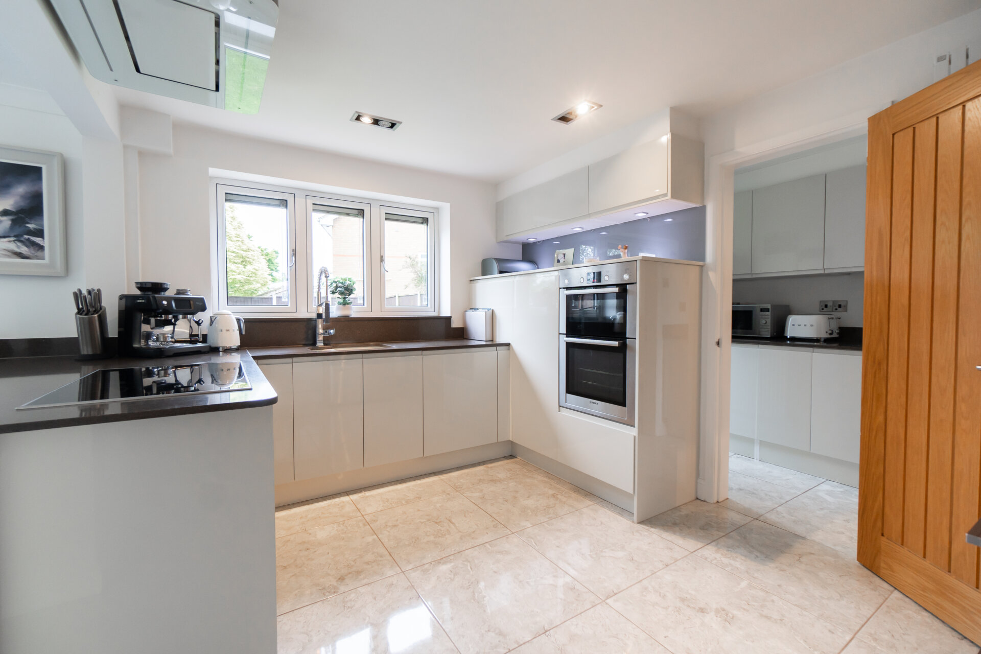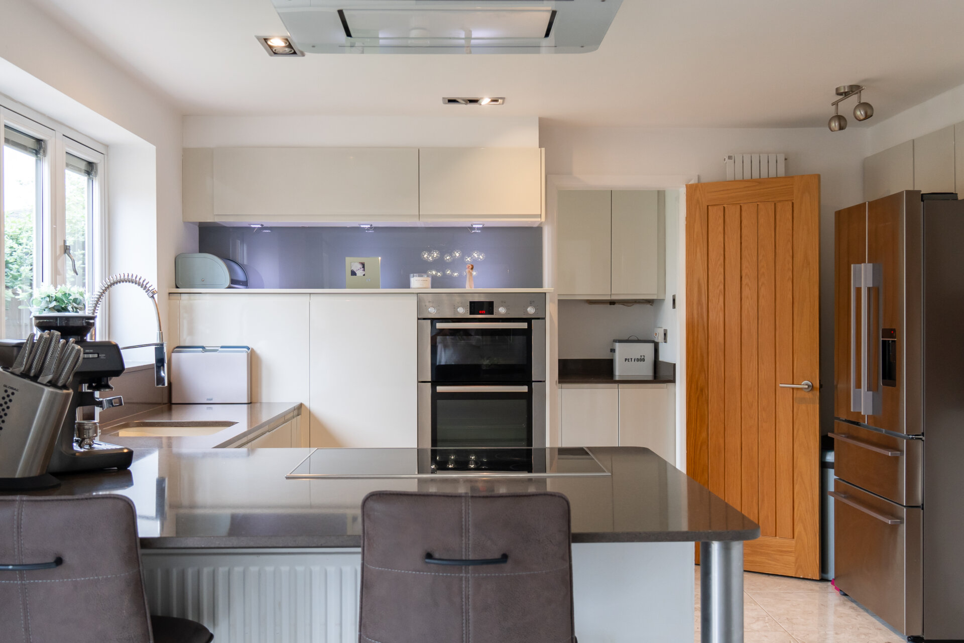 Kitchen - A Steven Christopher kitchen - Cream Gloss finish wall, base and drawer units with Granite worktops, induction hob with stylish extractor hood over, integrated appliances including dishwasher, fridge, freezer, Bosch Oven & Grill, sink and waste unit with mixer tap over, splashbacks, double glazed window to the rear, complimentary breakfast bar with additional storage cupboards, redressed down lighters to ceiling, vertical modern radiator, door to the Utility Room and open to