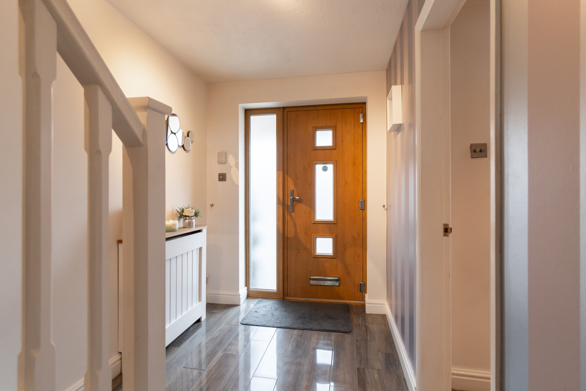 Composite front entrance door and windows, stairs to the first floor landing, attractive tiled floor, under the stairs storage and doors to