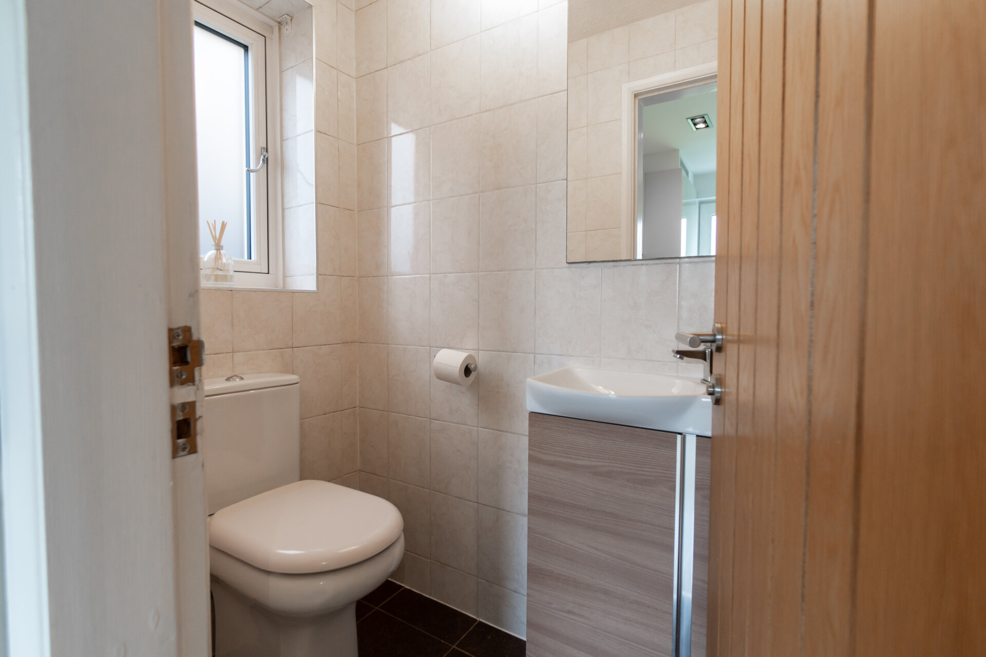 Low flush WC, sink with storage underneath, fully tiled walls and splashbacks, tiled floor, radiator and double glazed window to the side