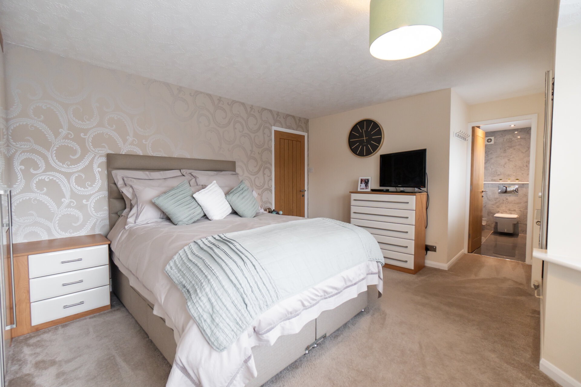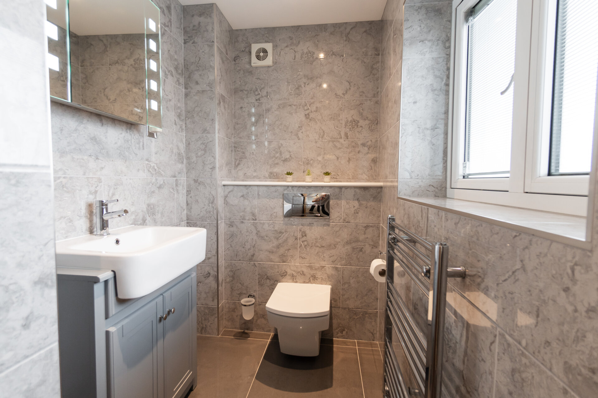 A large en-suite comprising a walk-in shower with shower from the mains, low flush WC, sink with storage underneath, fully tiled walls and splashbacks, spotlights, extractor fan and window to the front