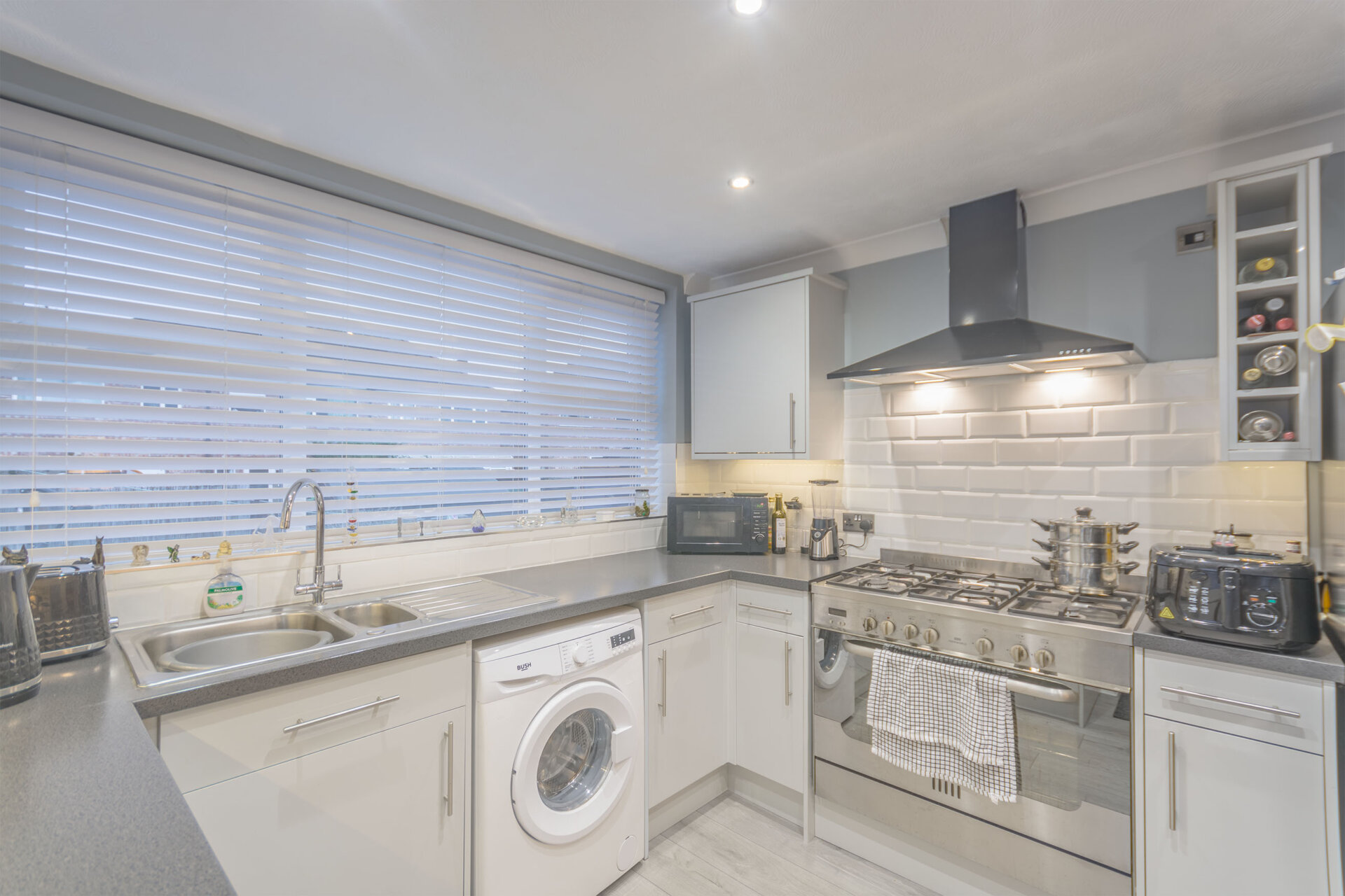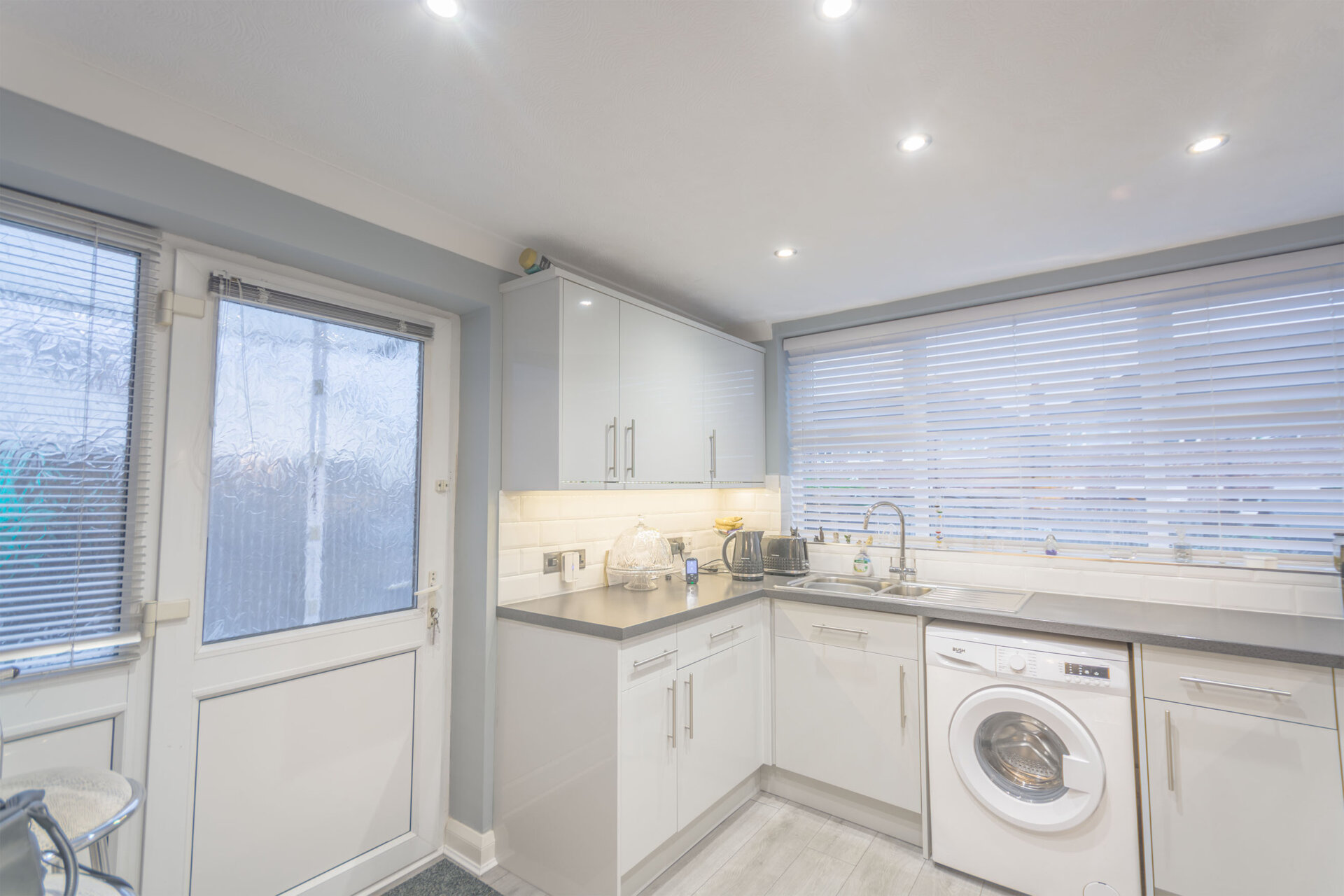 wall, base and drawer units with work surface over, stainless steel sink, waste and drainer unit with swan mixer tap over, tiled walls and splashbacks, laminate floor, plumbing for washing machine, appliance space, cooker space, coving to the ceiling, radiator, spot lights and UPVC window and rear exit door.
