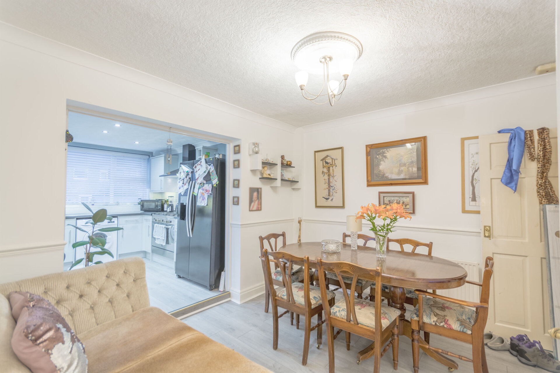 aminate floor, coving to the ceiling, dado rail, radiator, door to the under the stairs storage cupboard door to the bathroom and open to the