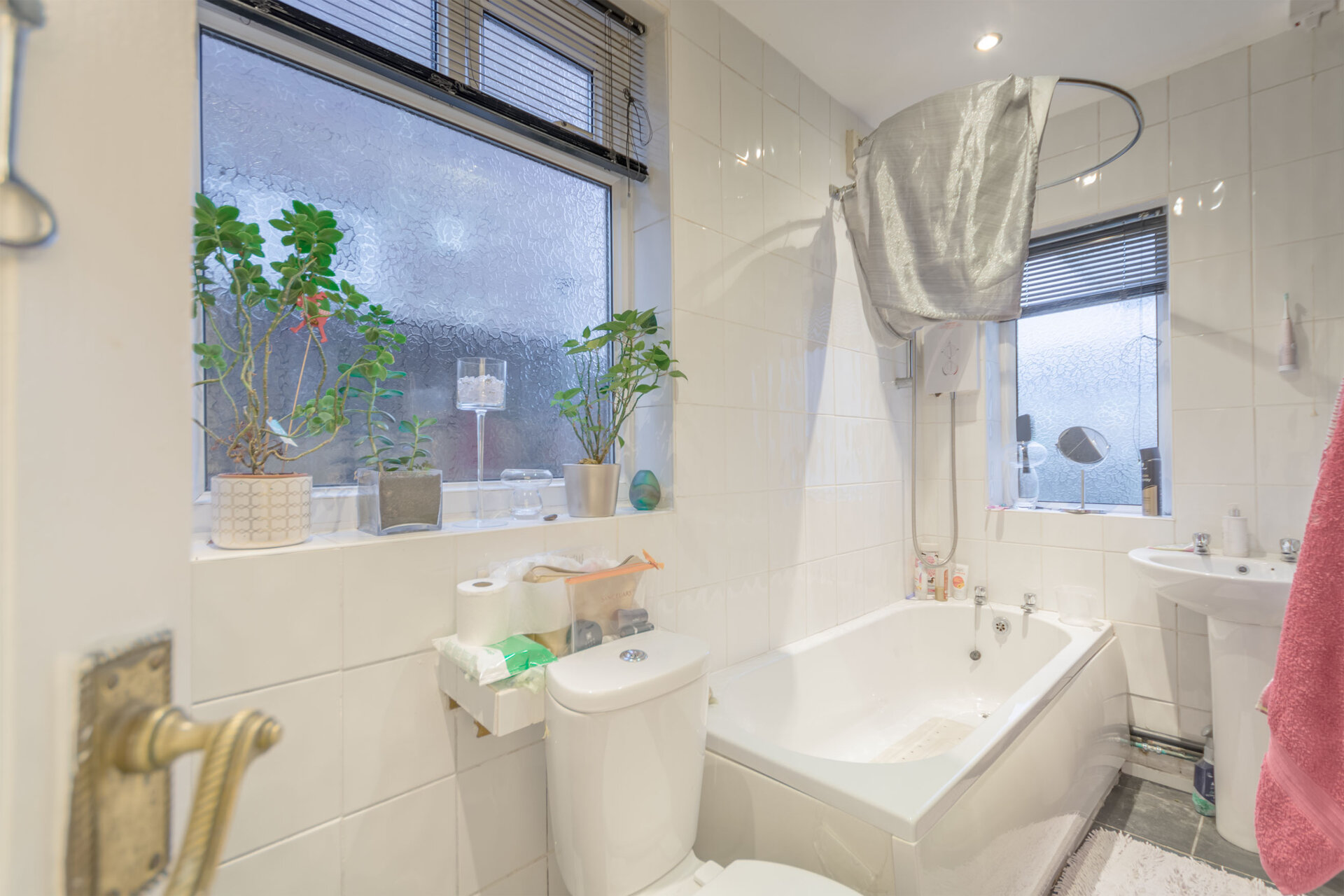 A white three piece suite comprising of a bath with a shower overhead, low flush w.c, pedestal wash hand basin, fully tiled walls and splashbacks, tiled floor, x2 UPVC double glazed windows and spotlights.