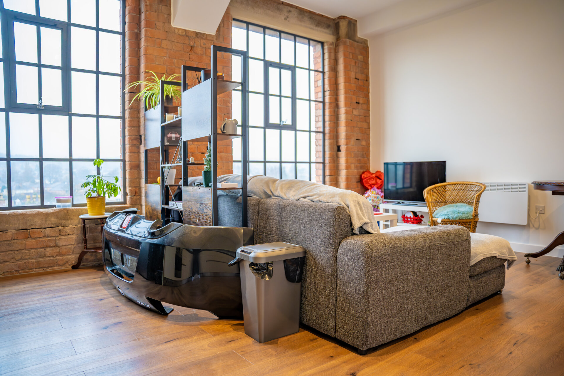 Exposed brick wall, Georgian style window with scenic views, modern electric storage heater and open to the kitchen.
