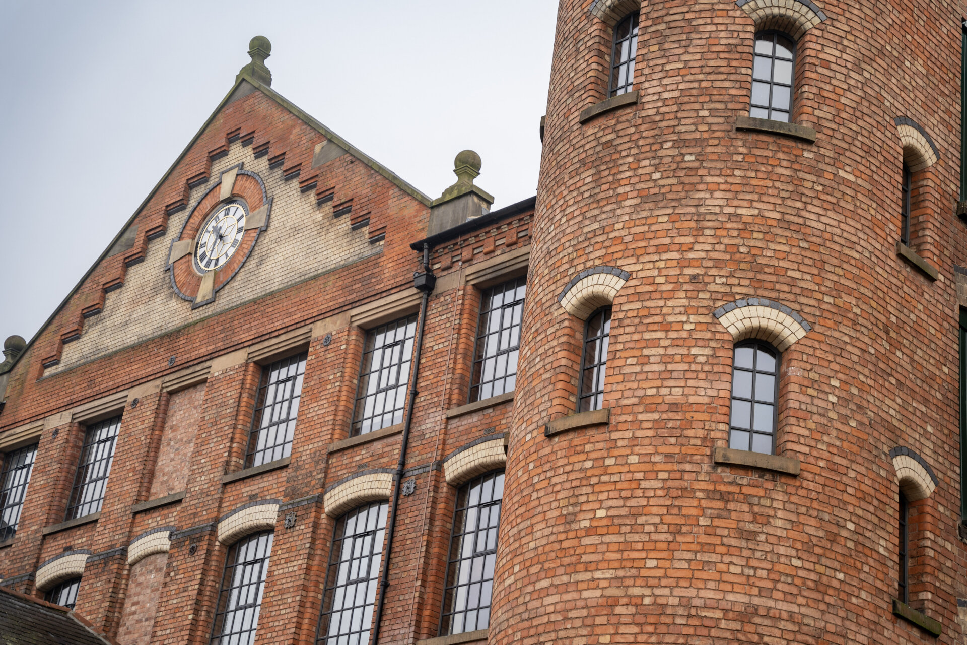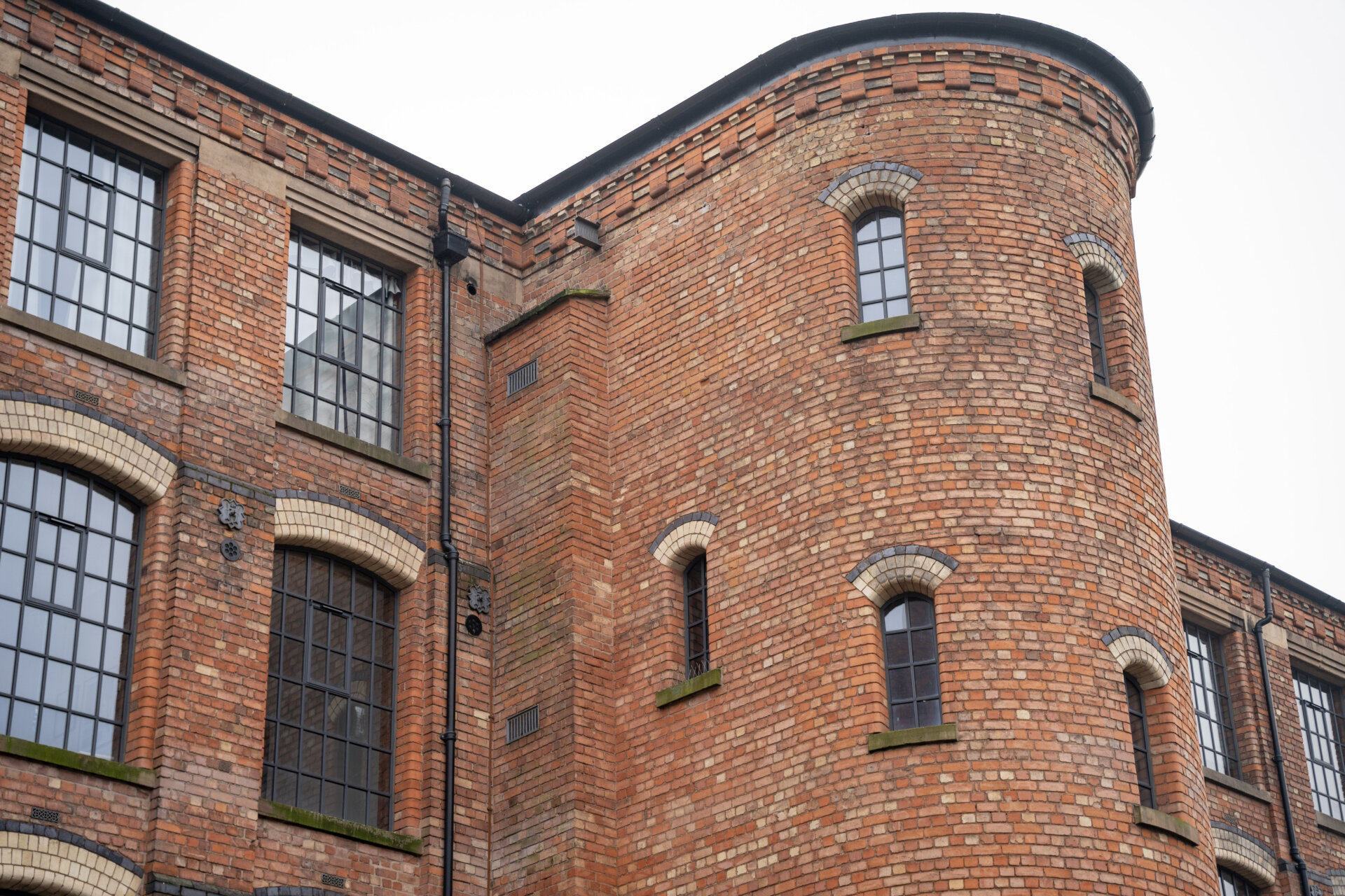 Georgian style window with scenic views, modern electric storage heater, exposed brick wall, spotlights.