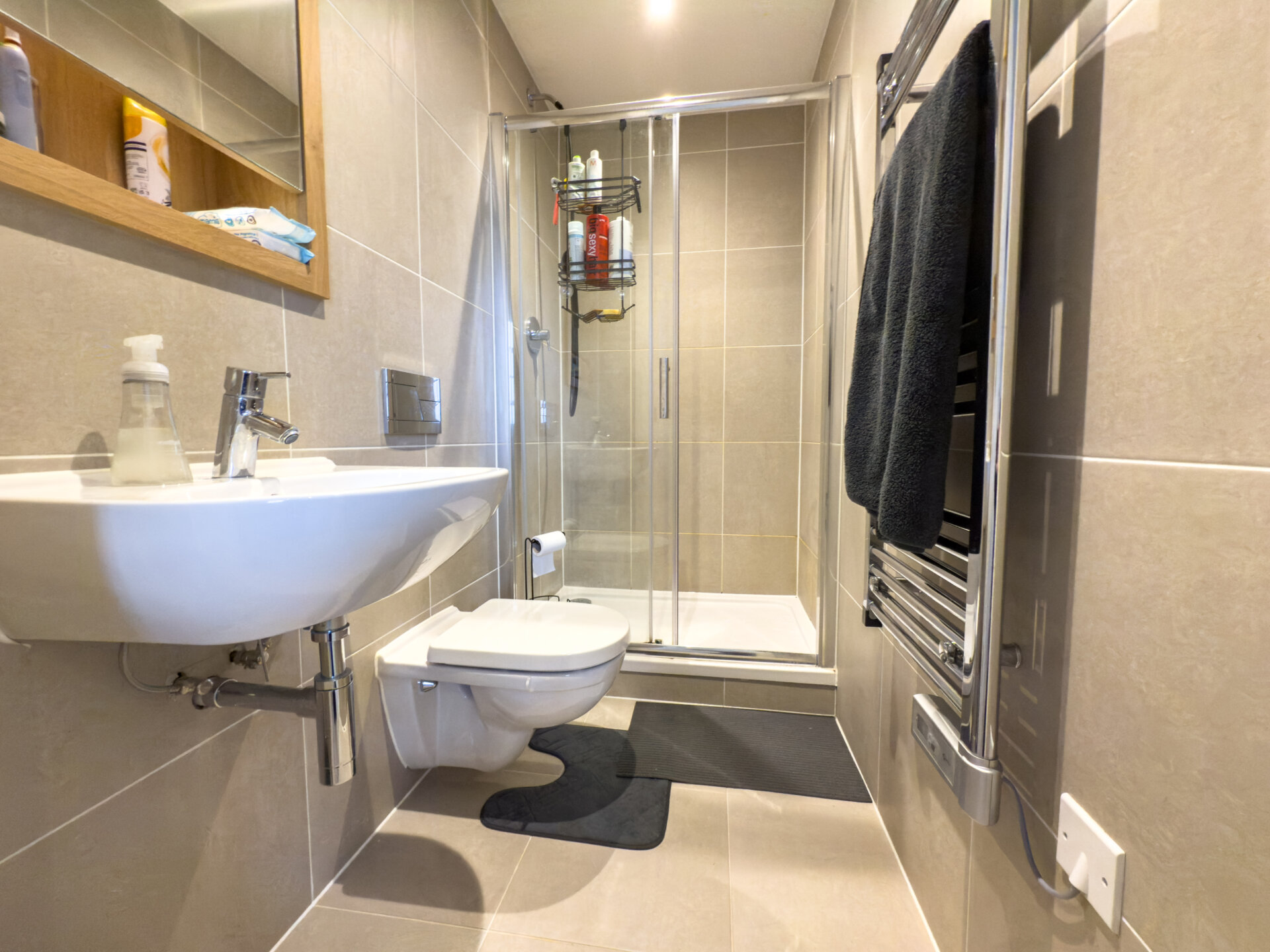 Walk-in shower cubicle with shower from the mains, low flush w.c, sink, fully tiled walls and splasbacks, tiled floor, extractor fan, chrome heated towel rail.