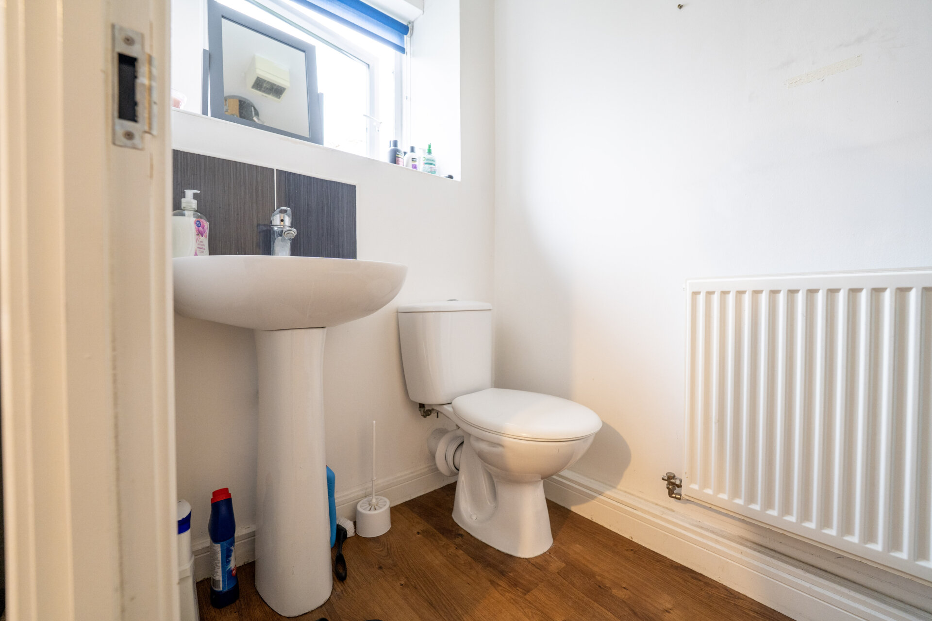 Walk-in shower cubicle with shower from the mains, pedestal wash hand basin, low flush w.c, tiled walls and splashbacks, extractor fan, radiator.