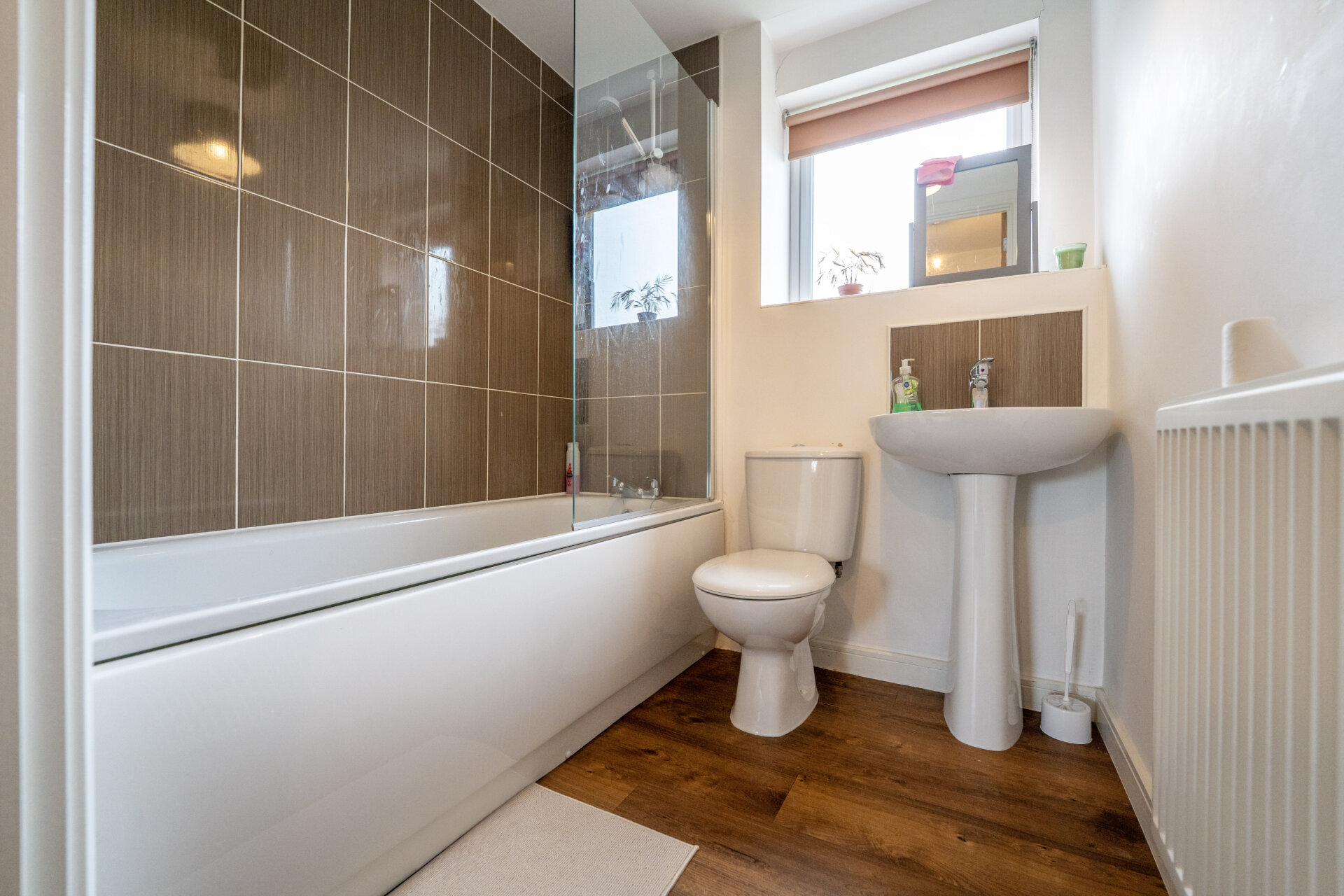 Panelled bath with electric shower over, low flush w.c, pedestal wash hand basin, radiator, tiled walls and splahbacks, extractor fan, UPVC double glazed window.
