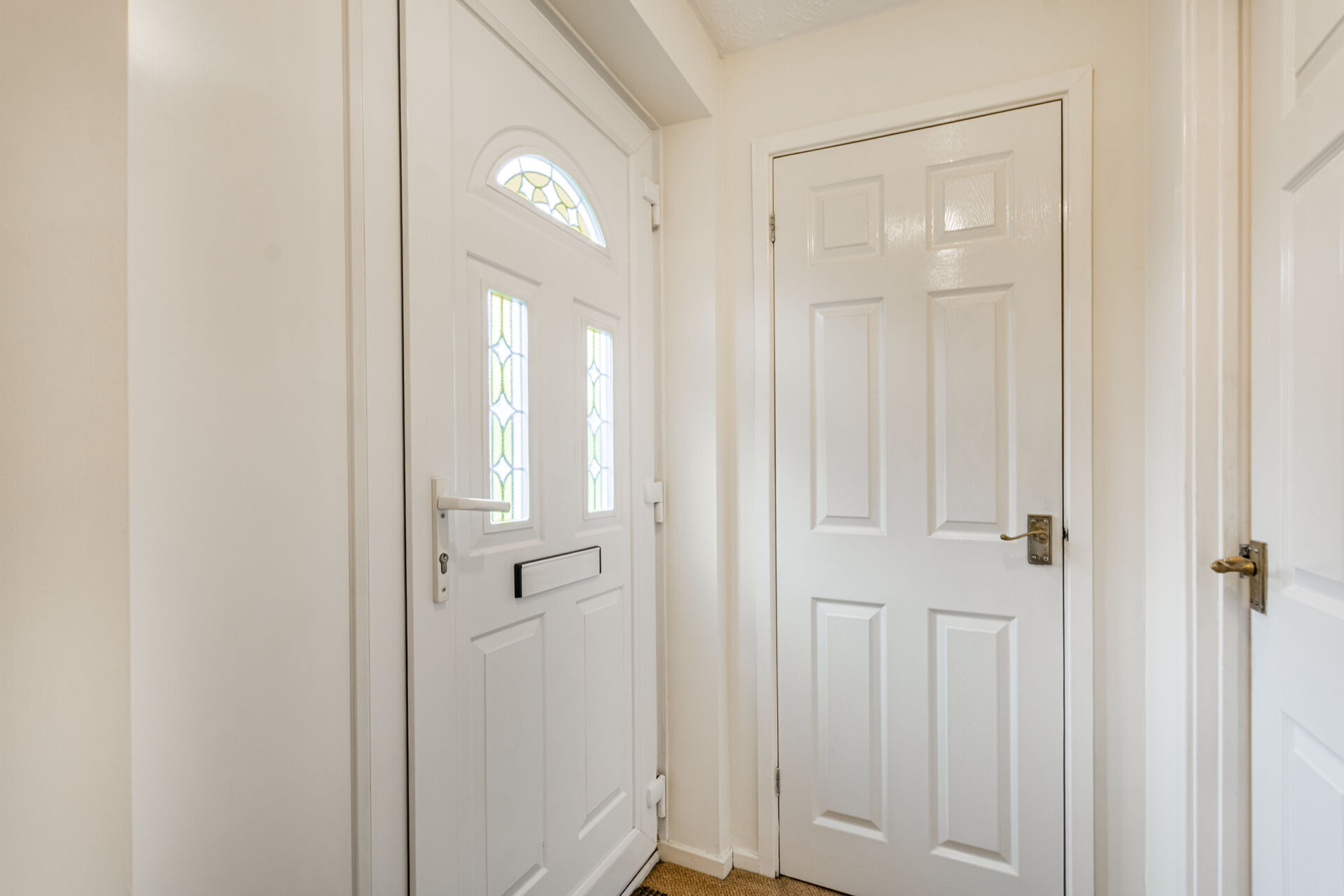 UPVC double glazed front entrance door, radiator, door to cloaks cupboard and doors to