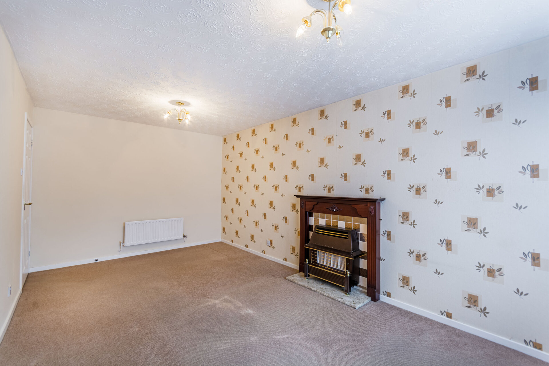 UPVC double glazed window to the front, radiator, gas fire with Adam style surround and door to