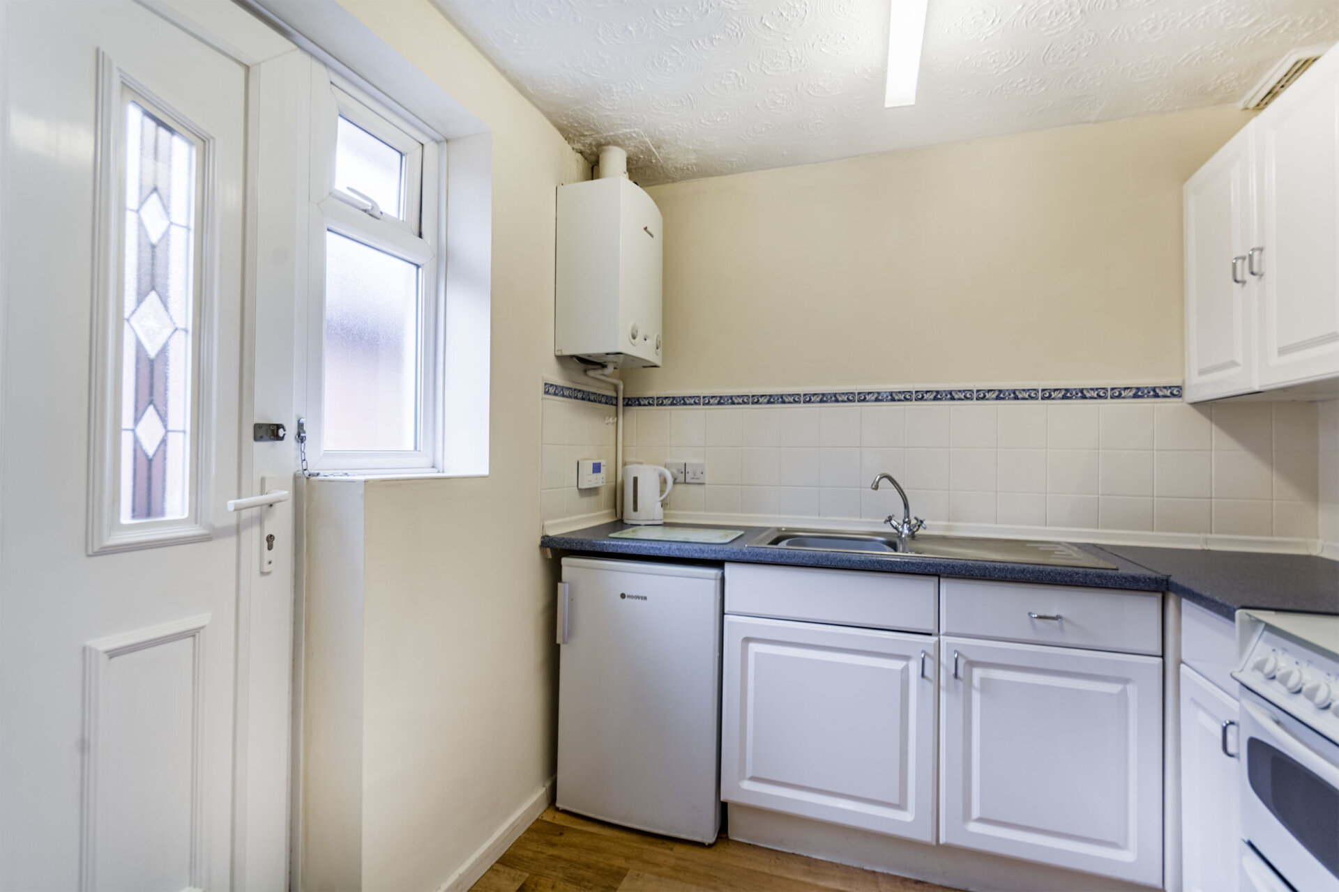 Wall, base and drawer units with work surface over, stainless steel sink and drainer unit with mixer tap over, tiled walls and splashbacks, cooker space, appliance space, plumbing for automatic washing machine, radiator, UPVC double glazed window and rear exit door.