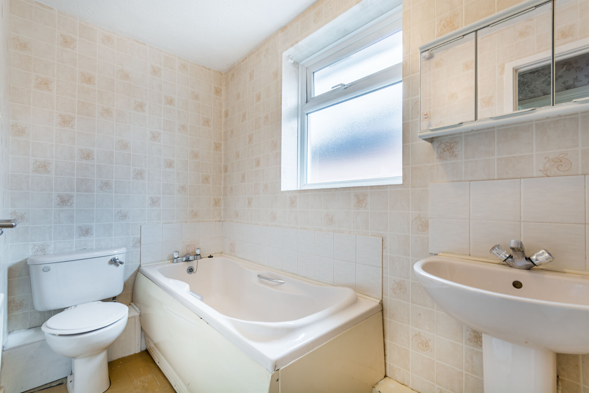 A three piece suite comprising a panelled bath, low flush w.c, pedestal wash hand basin, tiled walls and splashbacks, mounted wall heater, radiator, shaver point and UPVC double glazed window to the side.