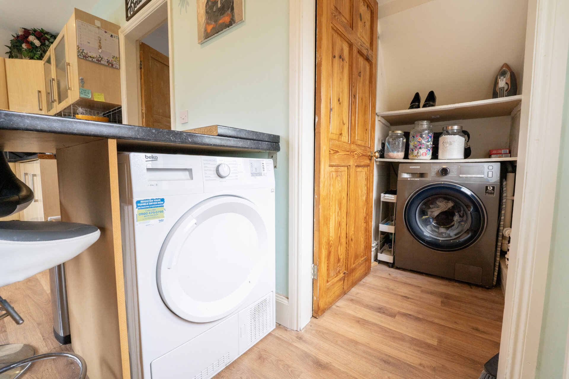 Wall, base and drawer units with work surface over, stainless steel sink and drainer unit with mixer tap over, tiled walls and splashbacks, built-in fridge and separate freezer, integrated dishwasher, cupboard housing the gas central heating boiler, breakfast bar, UPVC double glazed window and rear exit door and door to utility room having plumbing for the automatic washing machine and UPVC window,
