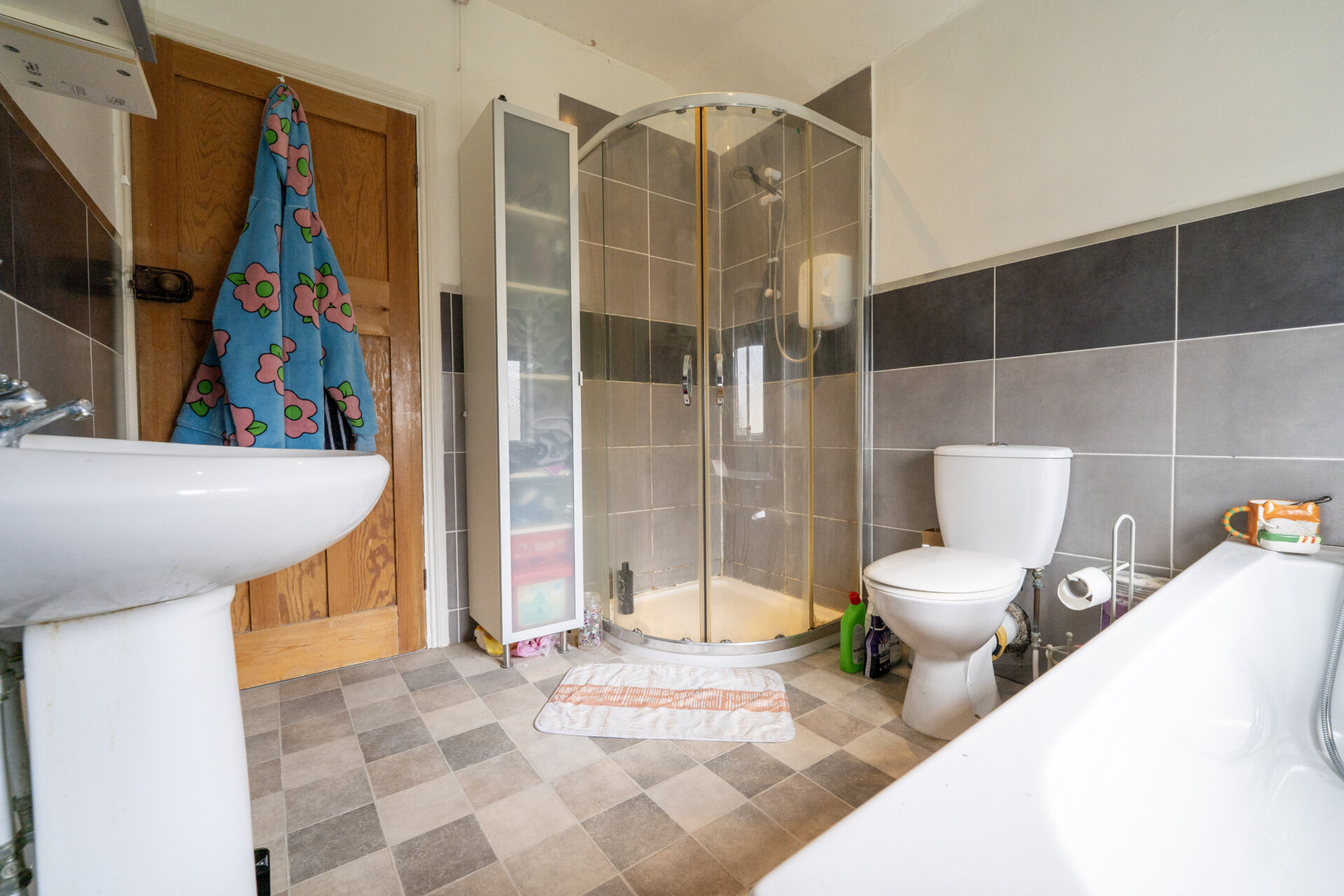 Panelled bath with a mixer tap, walk-in shower cubicle with electric shower, pedestal wash hand basin, low flush w.c, tiled walls and splashbacks, chrome heated towel rail, spotlights, UPVC double glazed window.