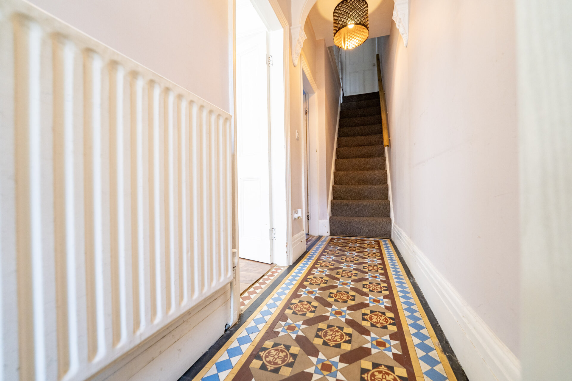 Minton tiled floor, stairs to the first floor landing, coving to the ceiling, radiator and doors to