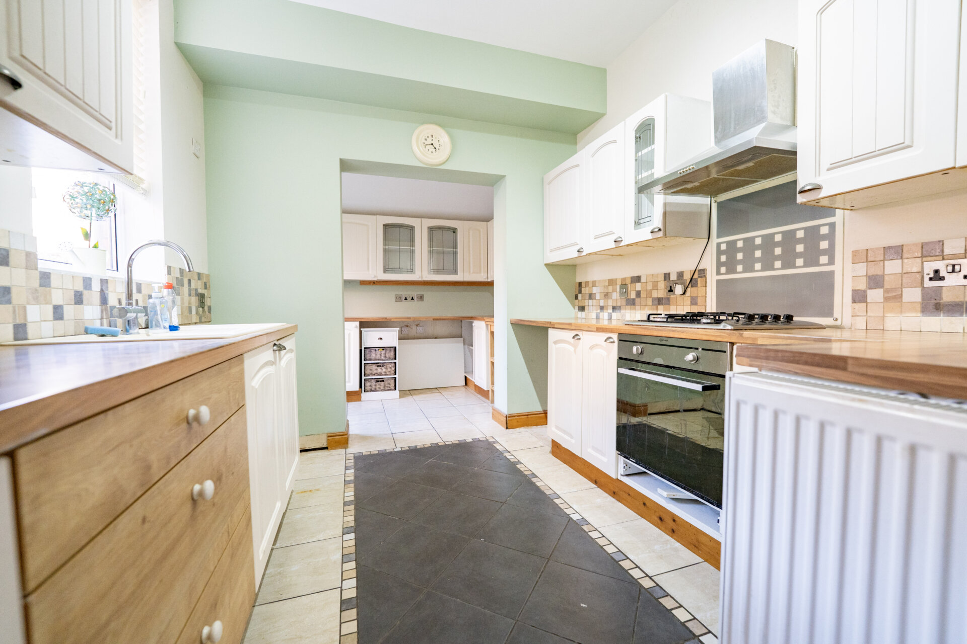 Wall, base and drawer units with work surface over, sink/waste/drainer unit with swan mixer tap over, tiled walls and splashbacks, radiator, appliance space, built-in oven, gas hob and extractor hood over, tiled floor and open to