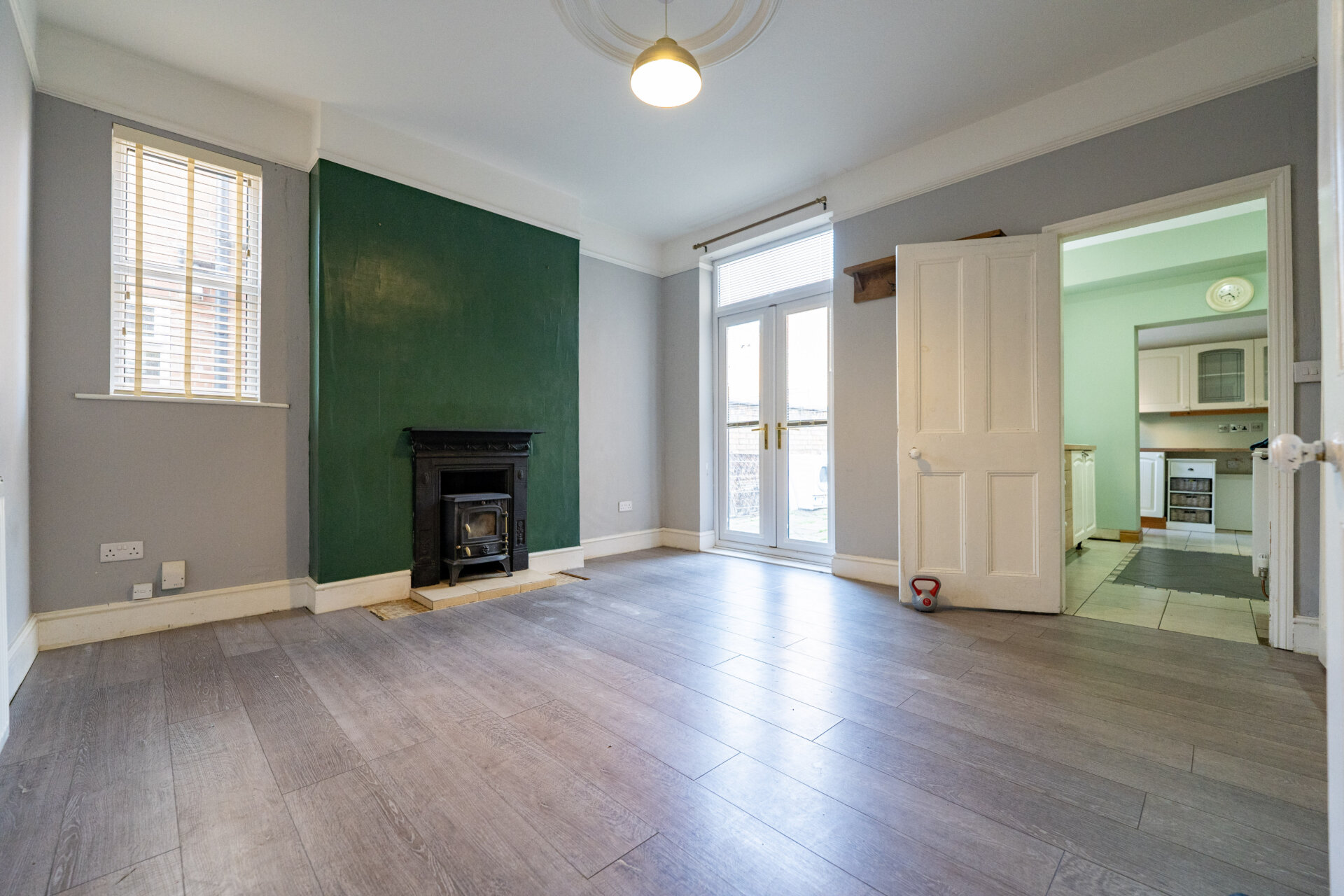 UPVC double glazed window and patio doors, doors to the under stairs storage, radiator, laminate floor, ceiling rose, picture rail and door to