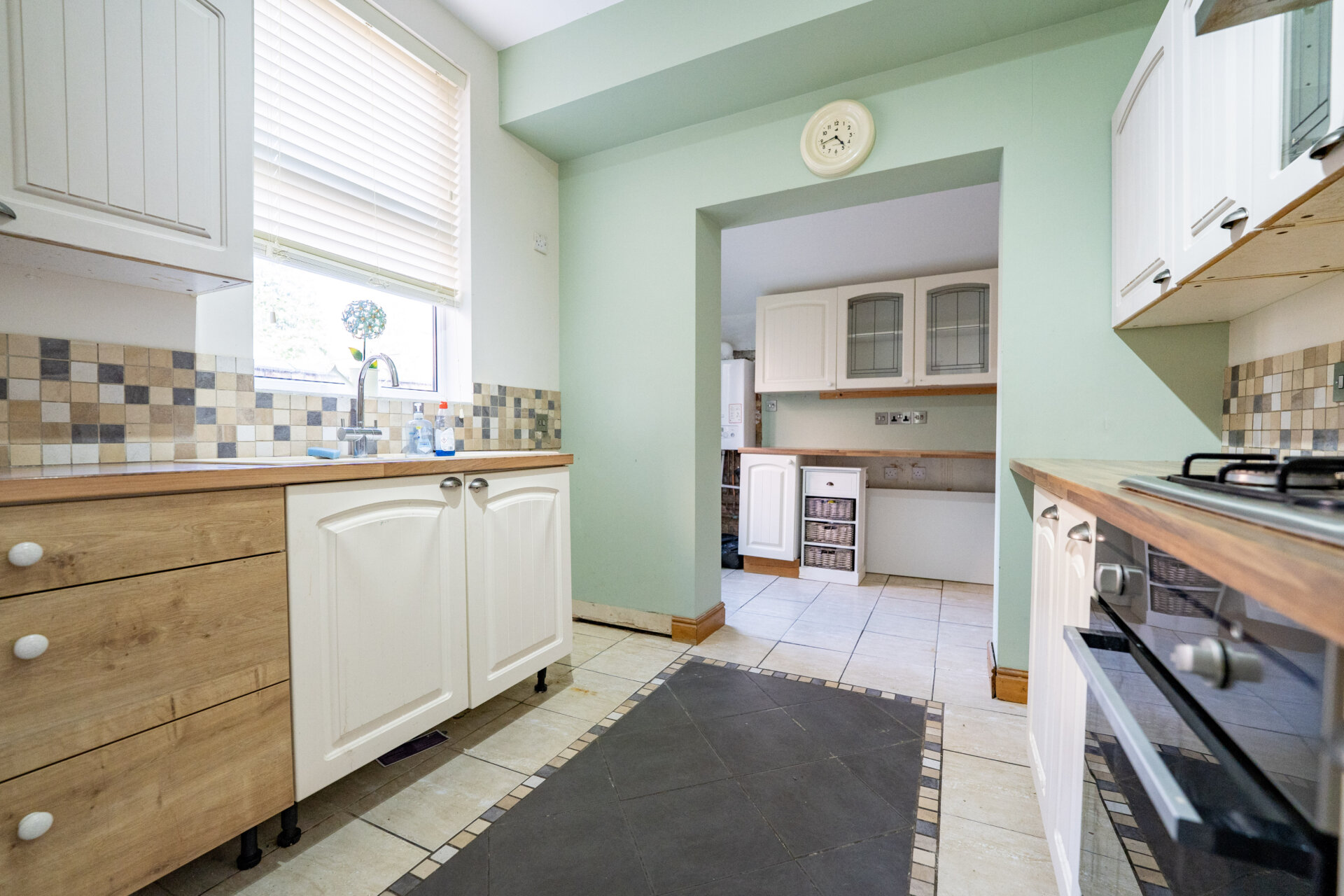 Wall and base units with work surface over, tiled floor, gas central heating boiler, UPVC double glazed window and rear exit door.