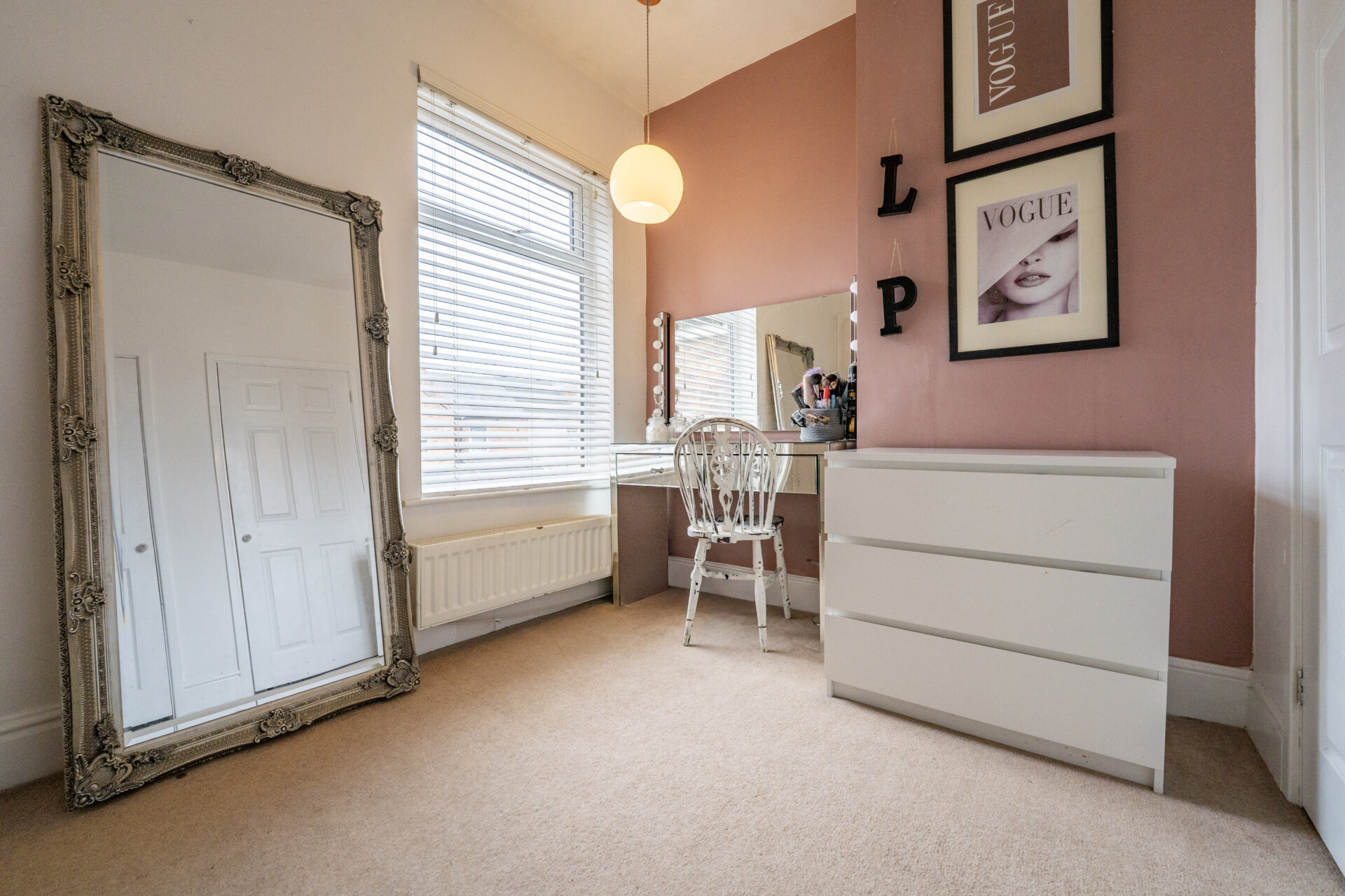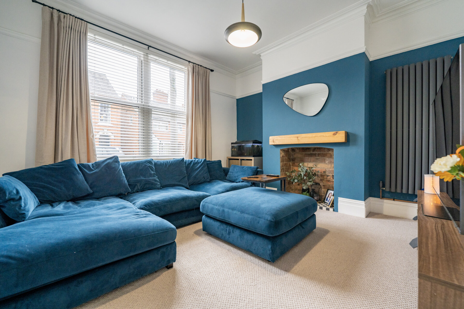 UPVC double glazed window, radiator, vertical modern radiator, coving to the ceiling, ceiling rose and picture rail.