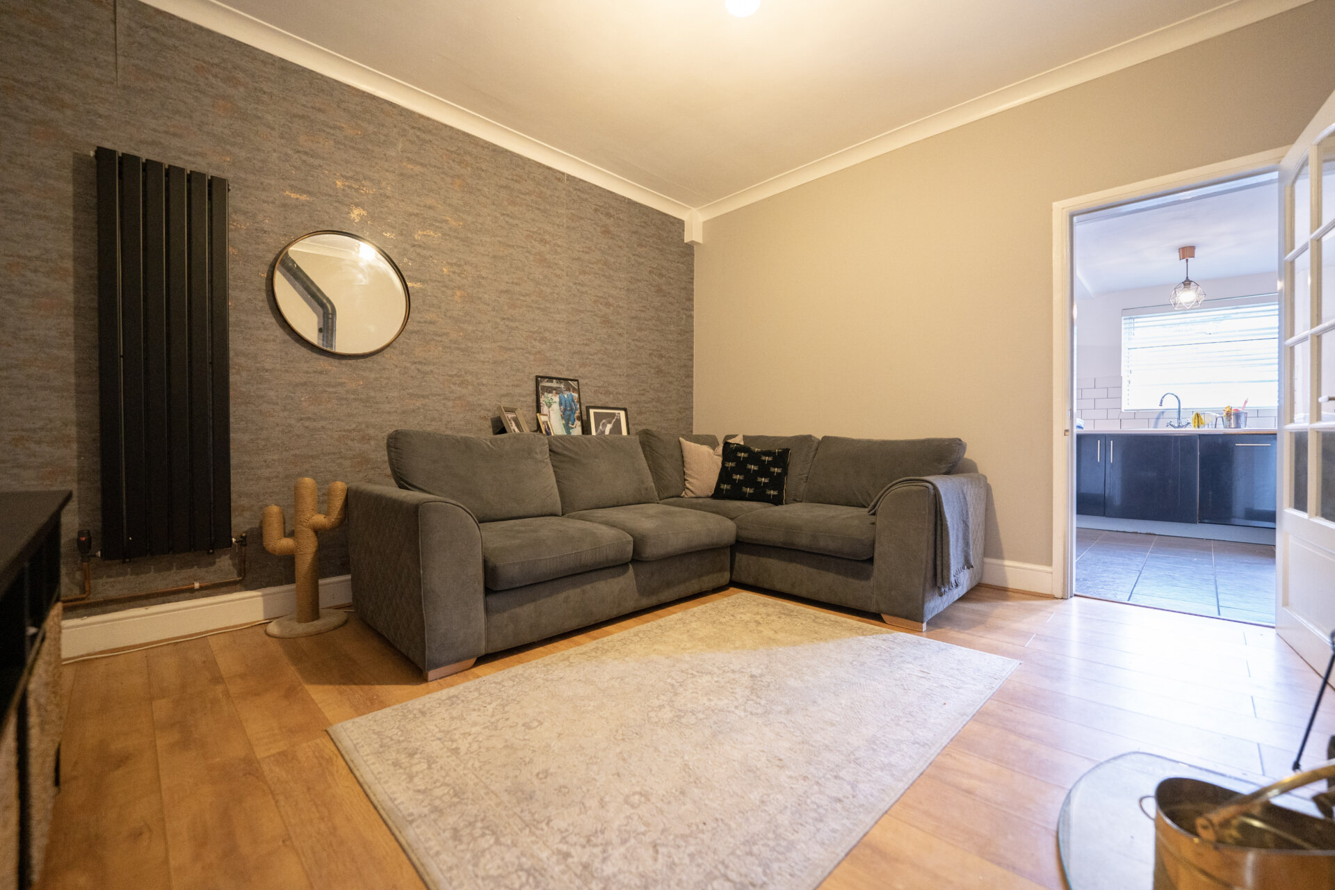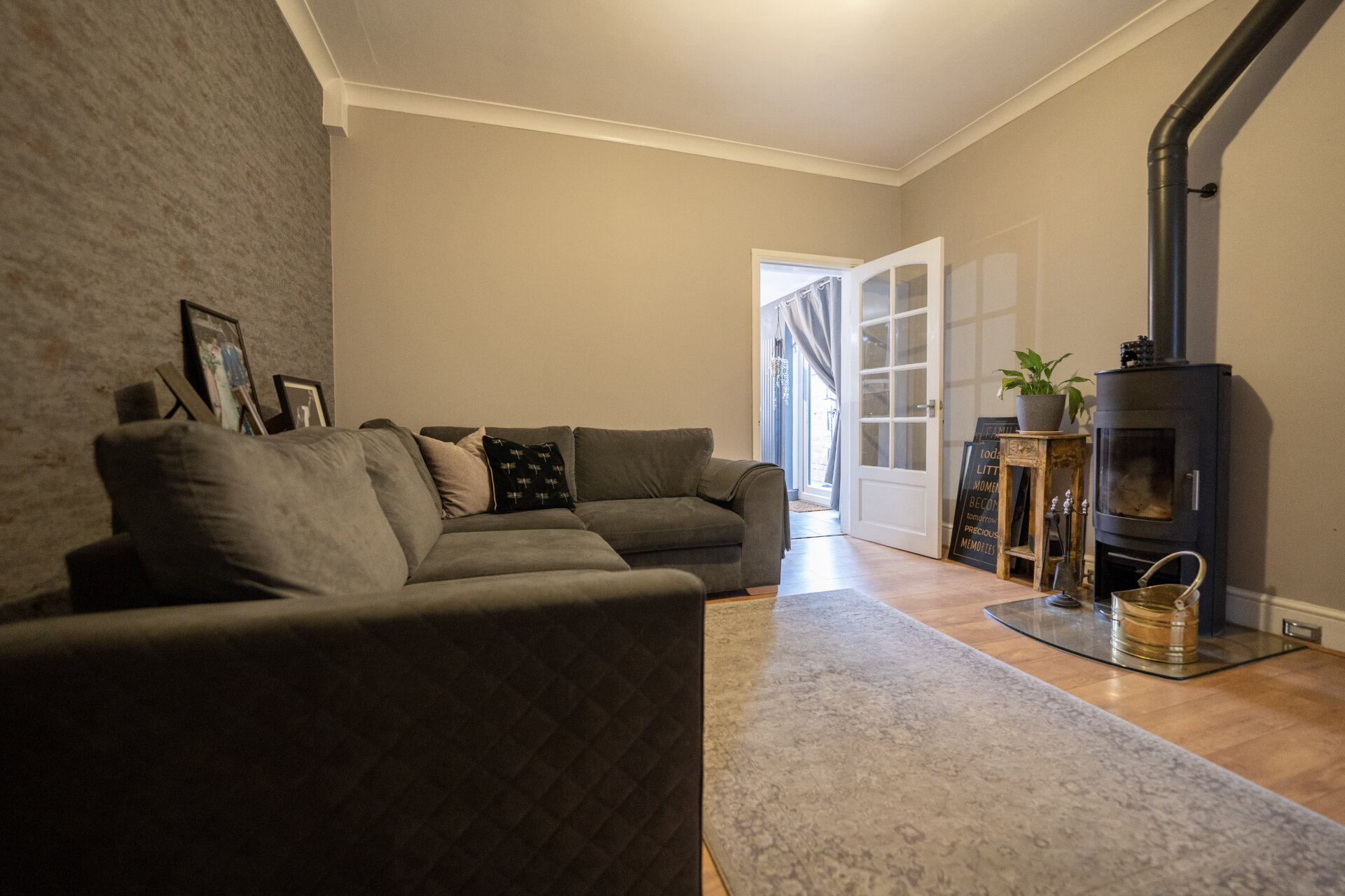 Log burner, understairs storage cupboard, vertical modern radiator, coving to the ceiling and door to