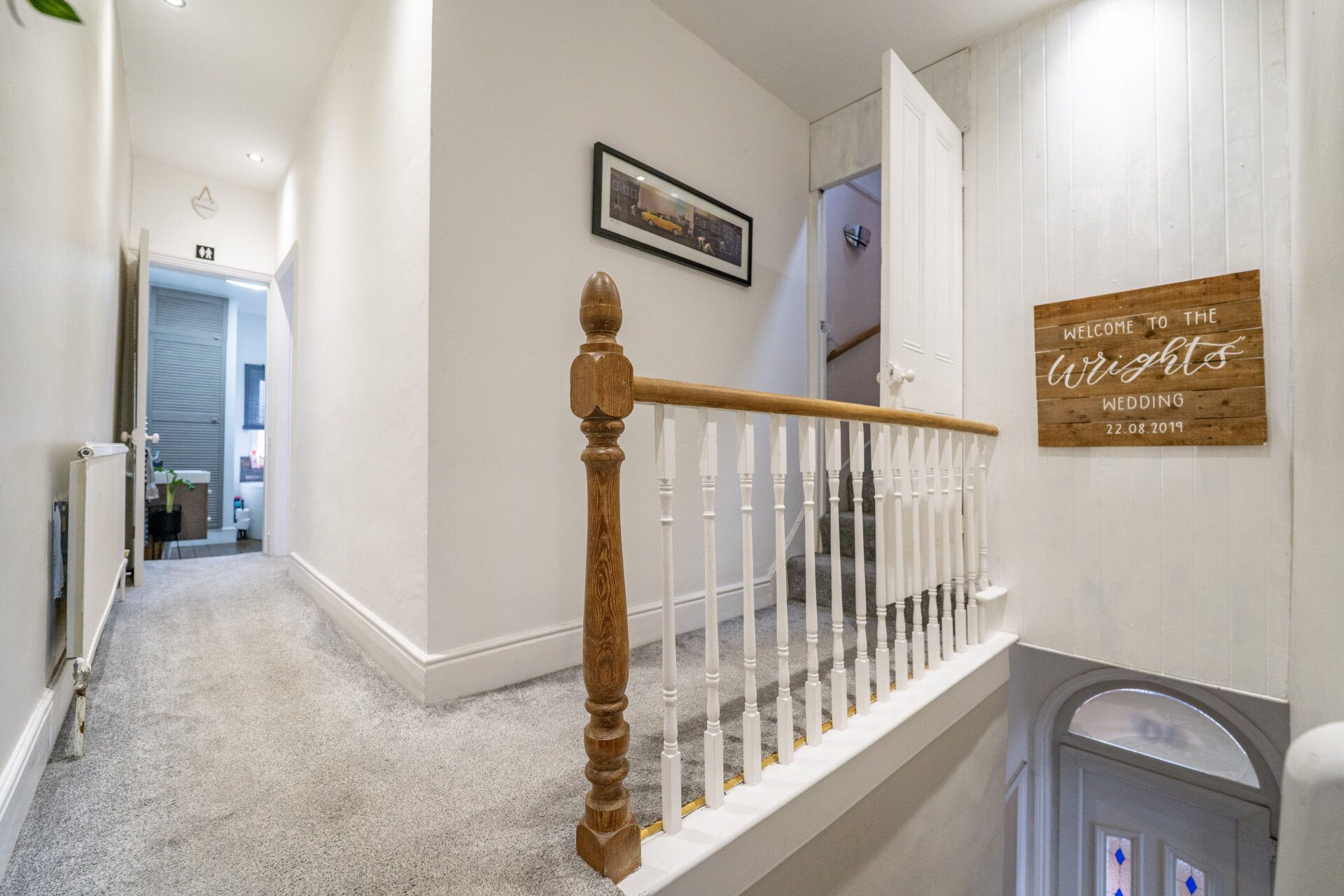 Stairs to the first floor landing, radiator, spot lights and doors to