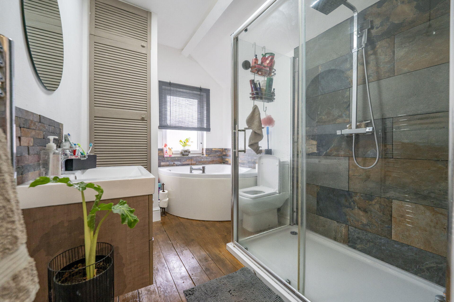 A four piece suite comprising a large walk-in shower having a shower from the mains with a waterfall shower head and a hand held shower head, corner bath, low flush w.d, sink with storage, tiled walls and splashbacks, chrome heated towle rail, UPVC double glazed window and cupboard housing the gas central heating boiler.
