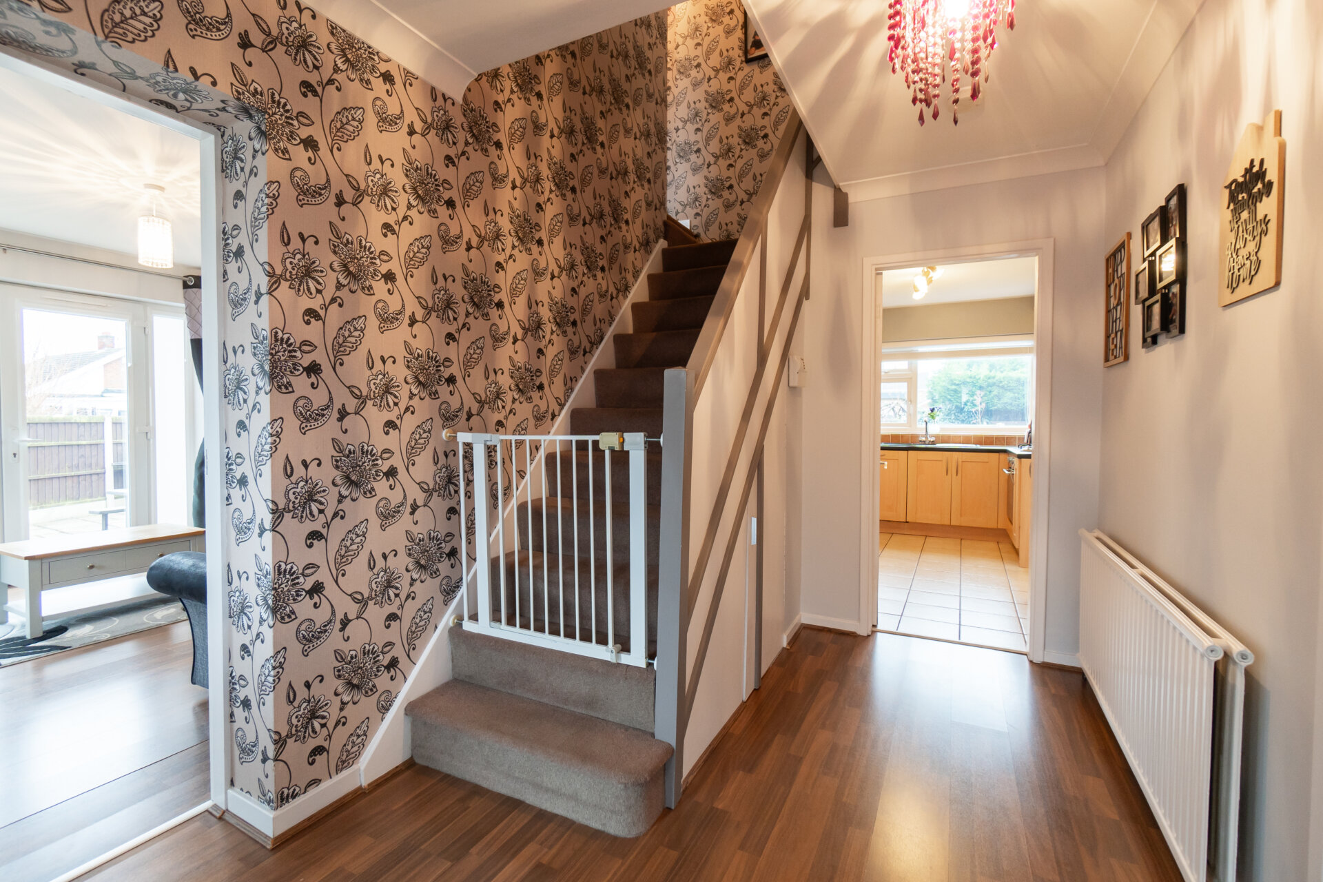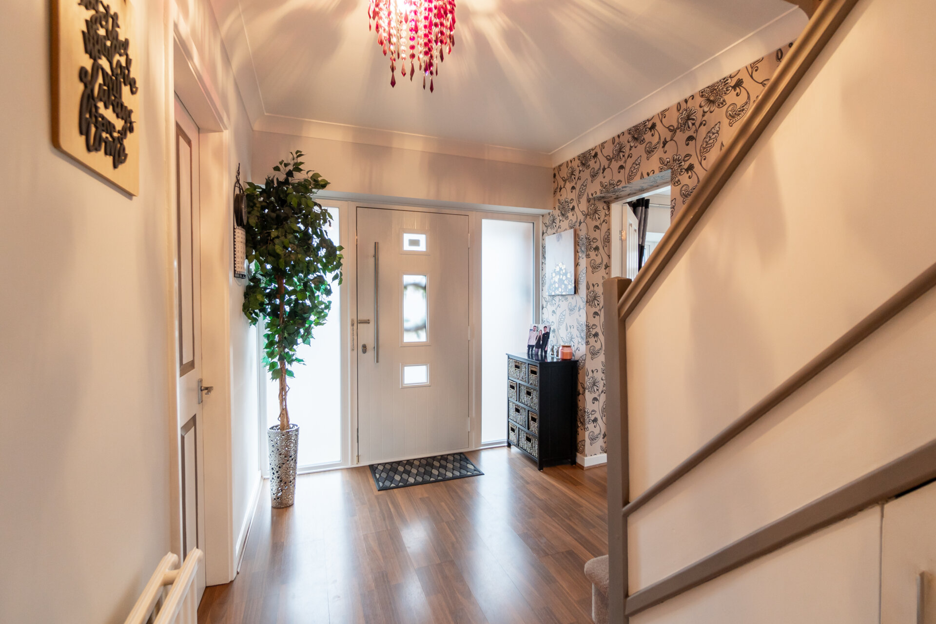 Composite front entrance door and window, stairs to the first floor landing, door to understairs storage cupboard, coving to the ceiling, radiator and doors to
