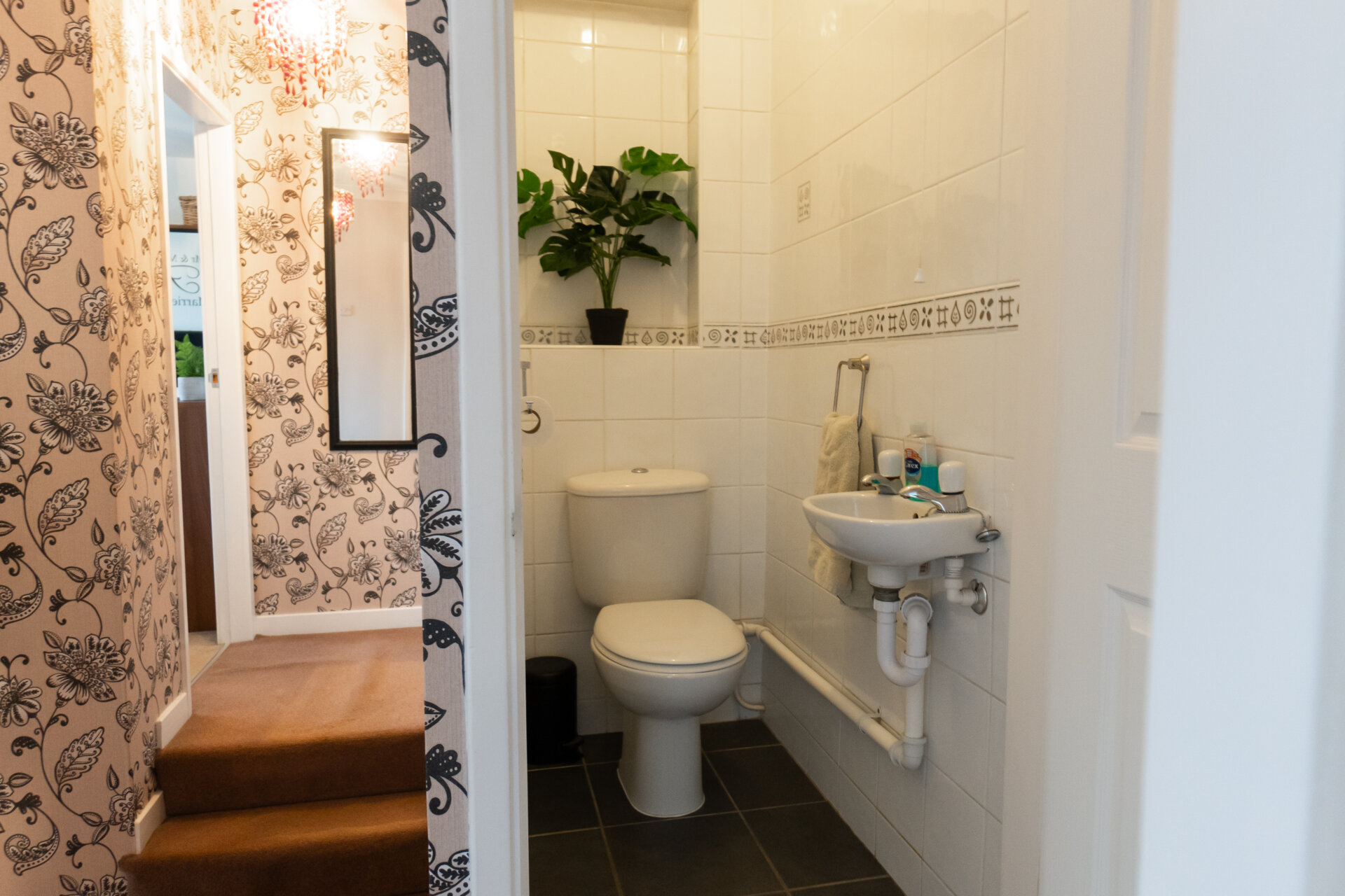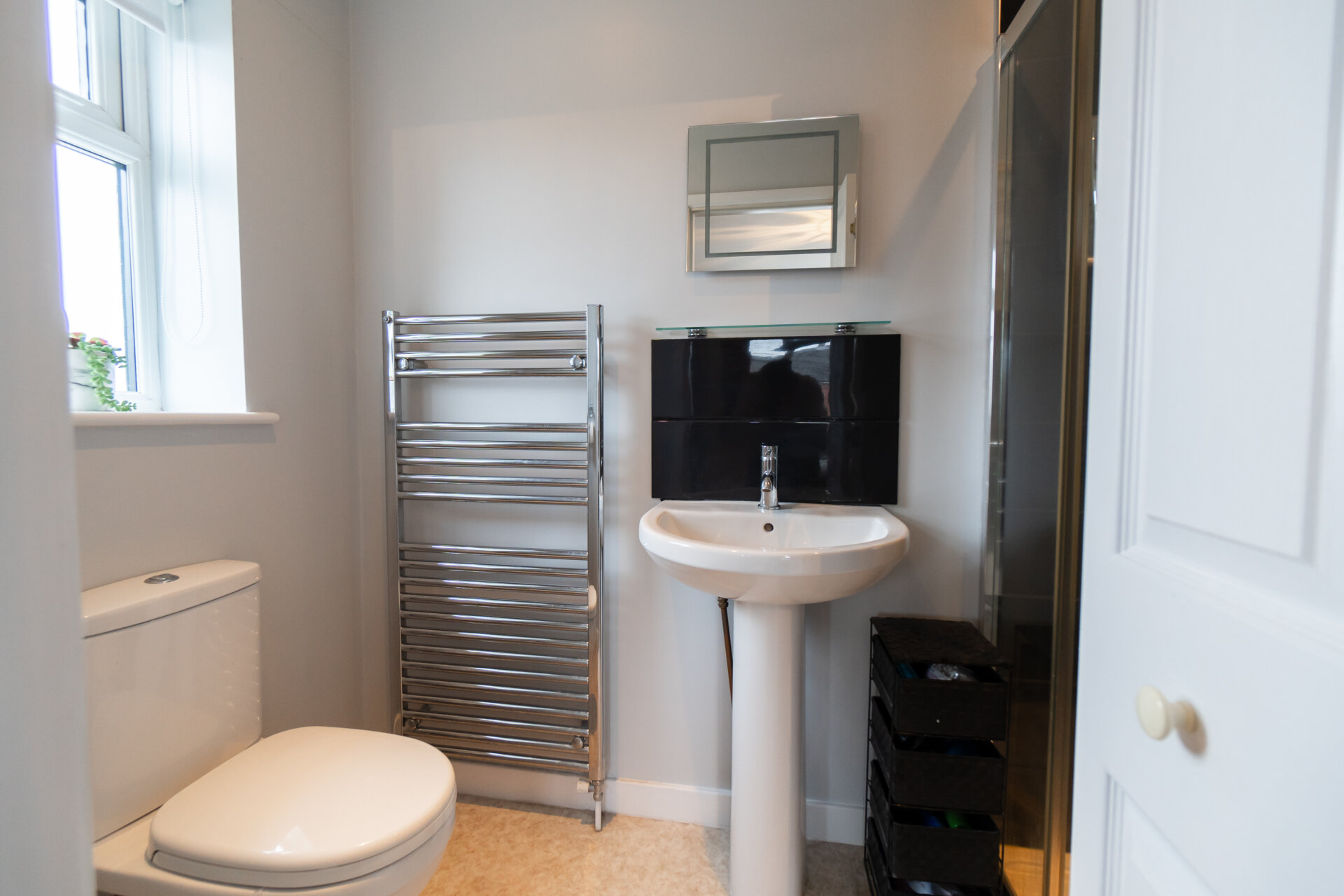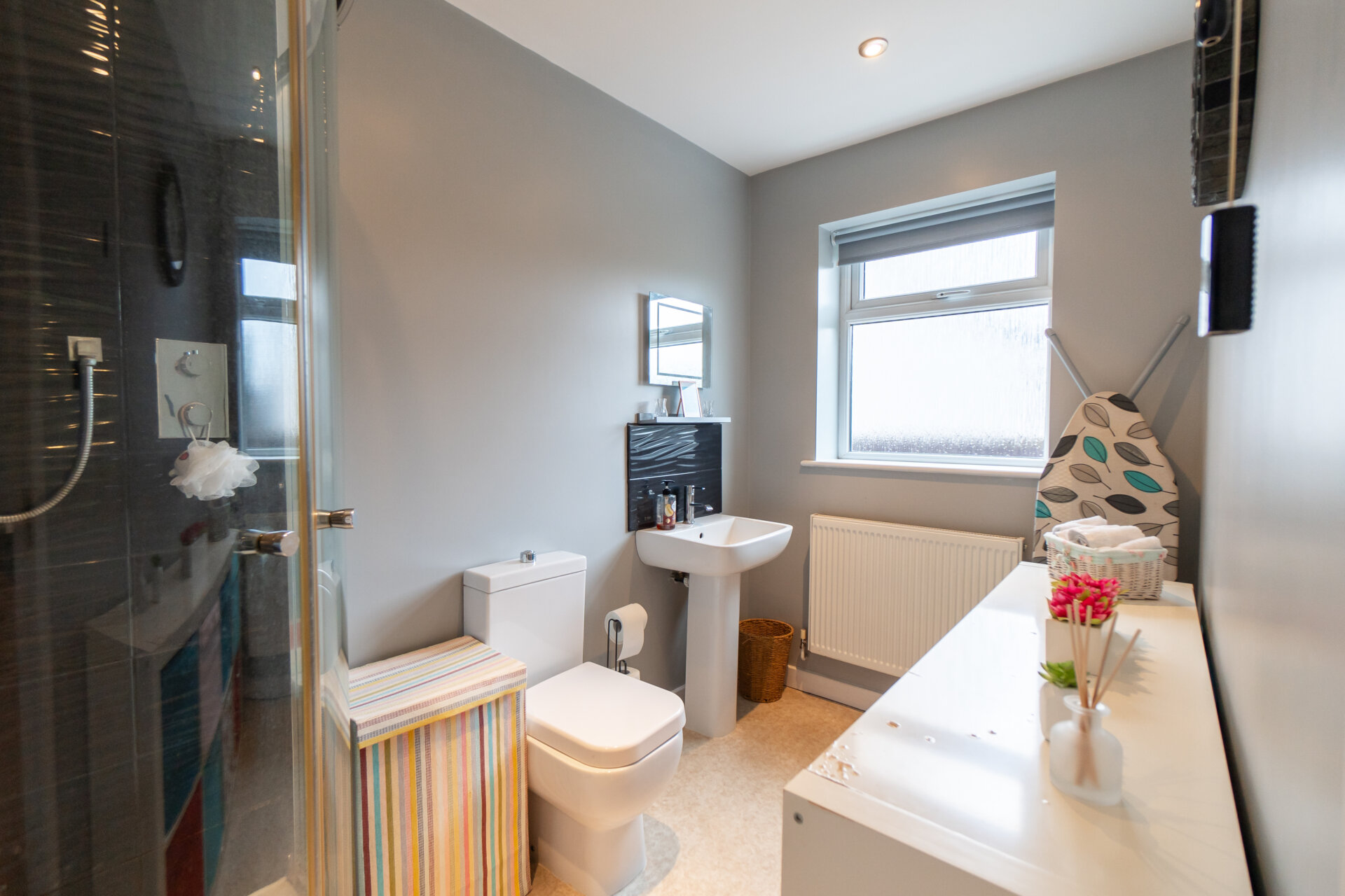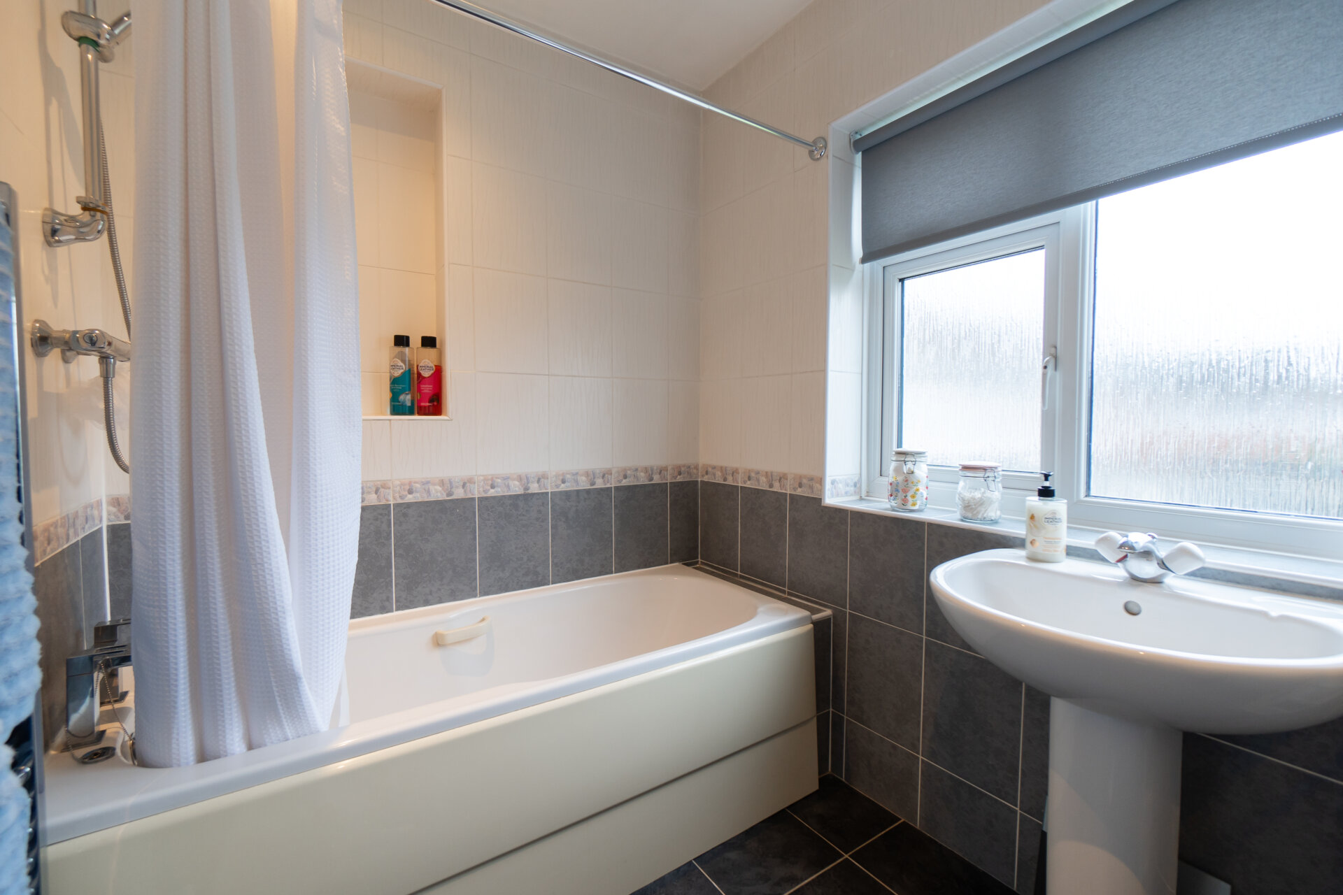 Bath with shower from the mains, pedestal wash hand basin, fully tiled walls and splashbacks, tiled floor, spotlights, chrome heated towel rail, extractor fan, UPVC double glazed window to the rear.